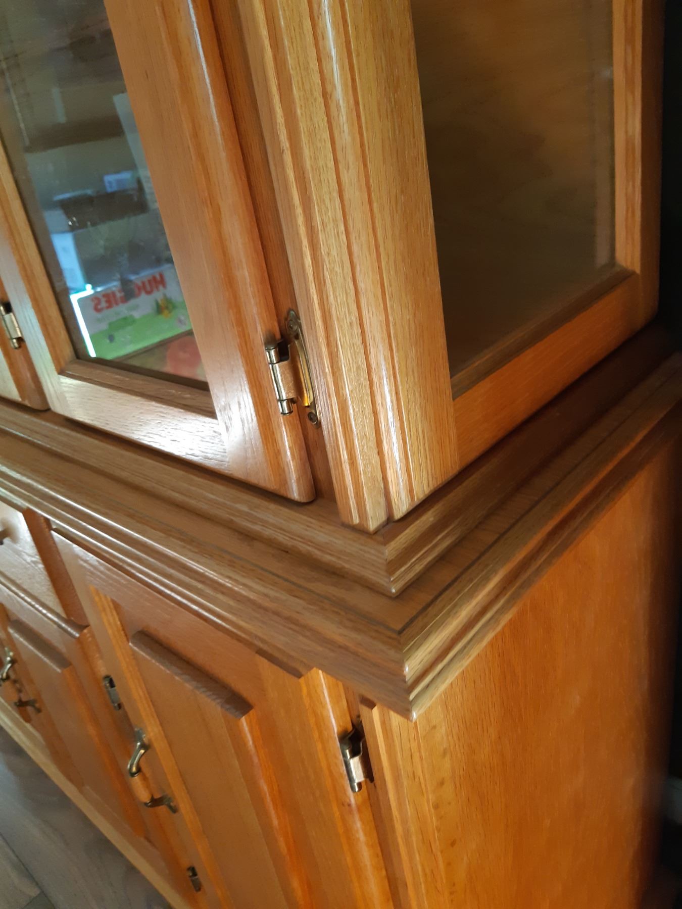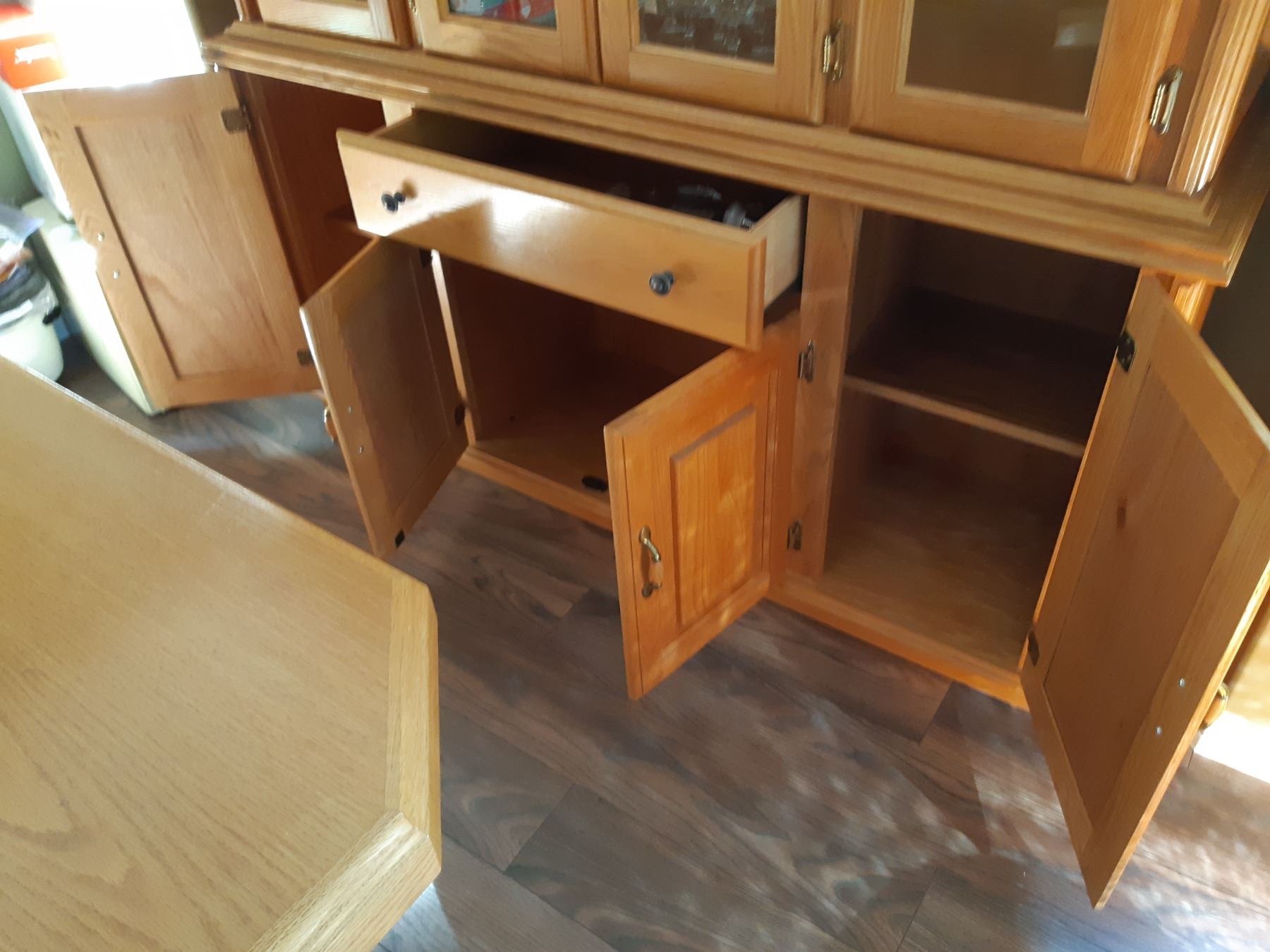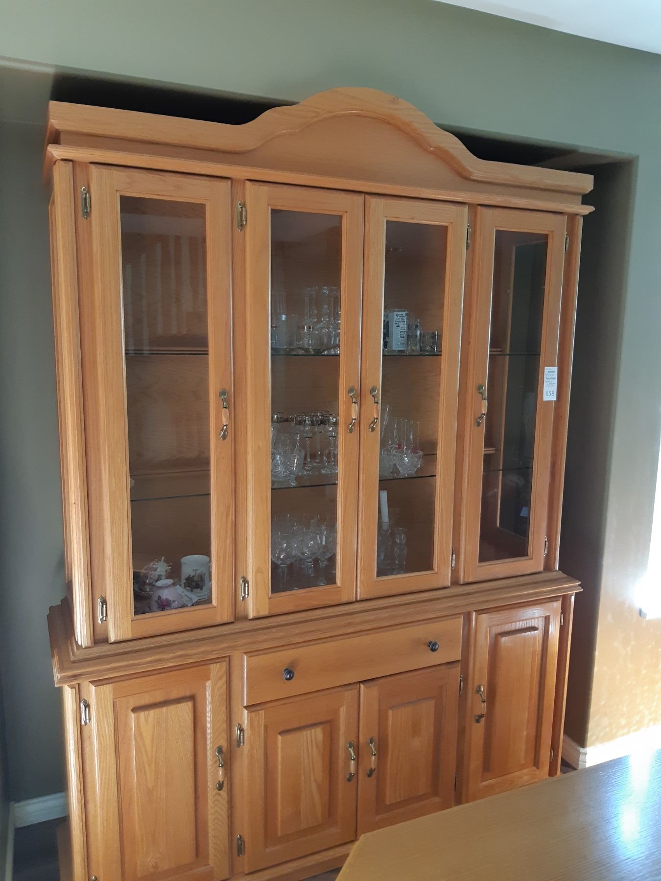 Hutch with lighted cabinet comes in 2 sections. Top has glass doors and 2 glass shelves. 63x17x85. Contents not included. Heavy bring help to remove and pickup at 12:30 pm