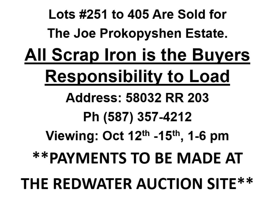 PAYMENT IN FULL: At the Redwater Auction Site, Oct 17th, 9-5pm OR by PH (780)446-9555