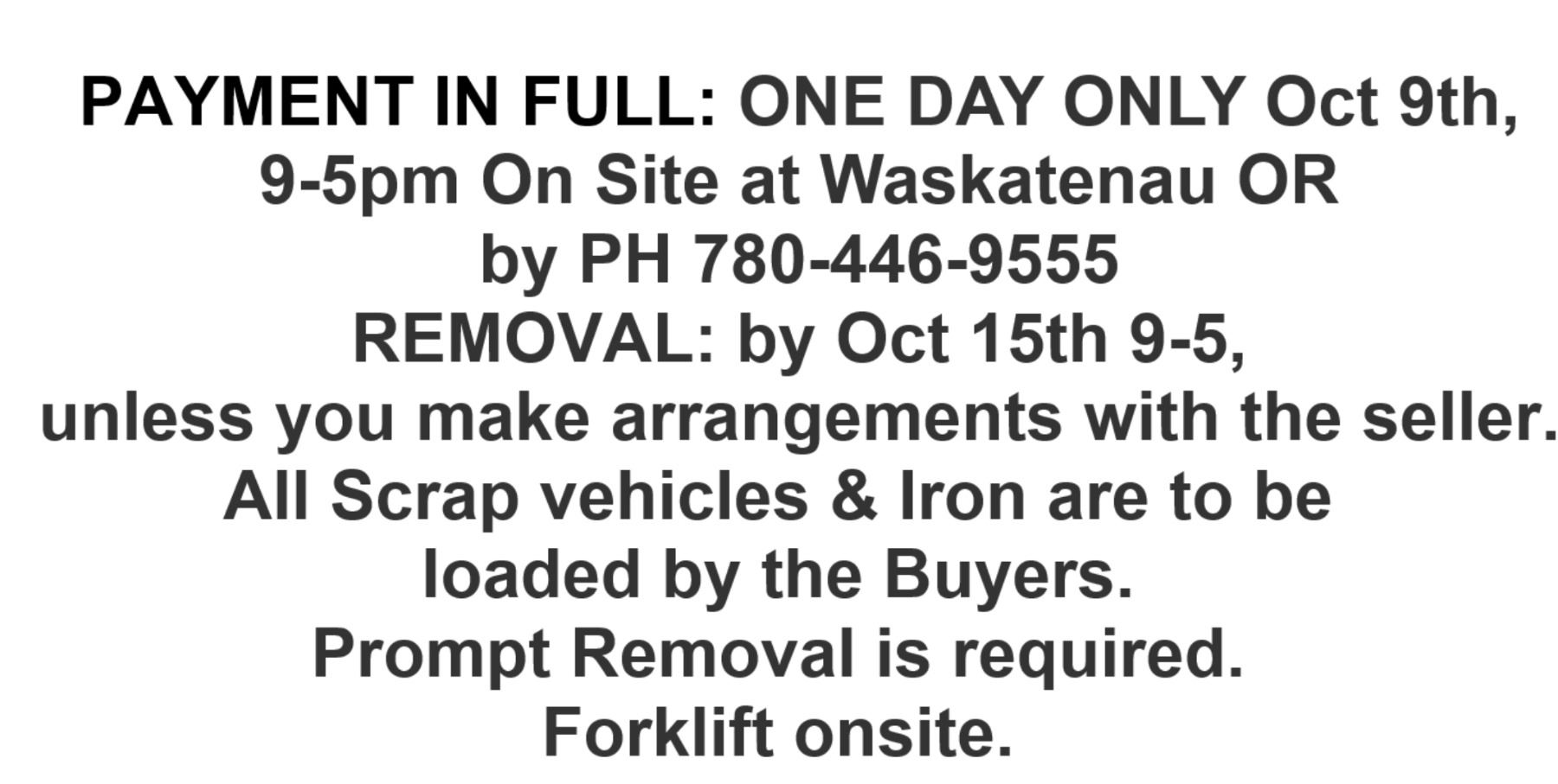 PAYMENT IN FULL: ONE DAY ONLY Oct 9th, 9-5pm On Site at Waskatenau OR by PH 780-446-9555