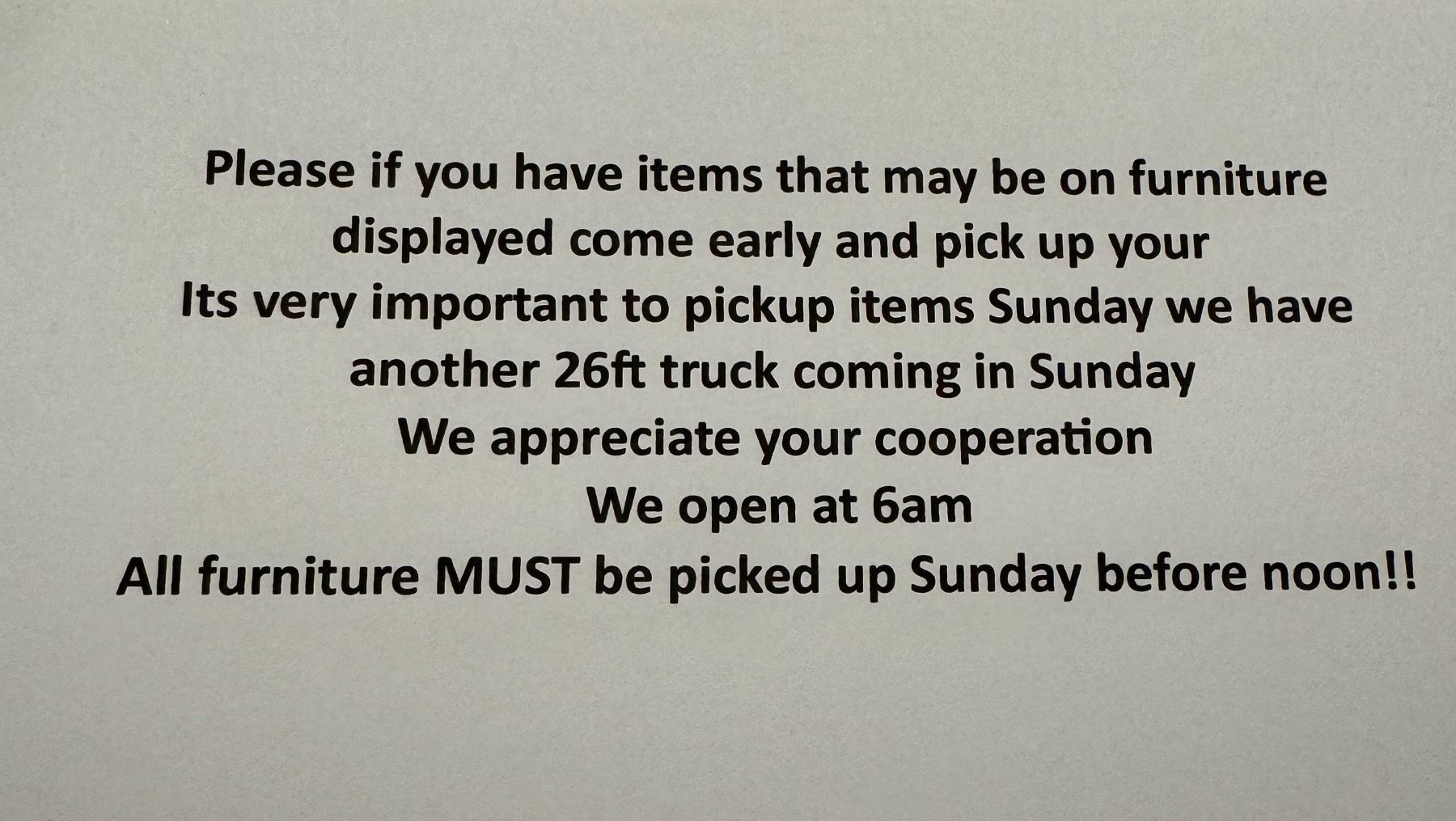 Pick up is Sunday 6:30AM-NOON Immediately Following the auction. Monday 7AM-10AM if needed. IF you so do not pick up these hours we will charge your credit card 10% handling fee. Items will be considered abandoned.