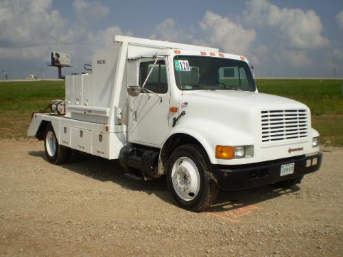 1991 INTERNATIONAL 4700 S/A FUEL & LUBE TRUCK, s/n 1HTSCNEM9MH361388: DT 466 DIESEL ENGINE, 5 SPEED TRANS., 12ft. 6in. BED, 2ft. EXTENSION, 800 GALLON DIESEL TANK, (6) PRODUCT TANKS, 12HP AIR COMPRESSOR, WASTE OIL TANK, ALEMITE AIR PUMPS, HOSES & REELS, STORAGE BOXES, 188in. WHEEL BASE