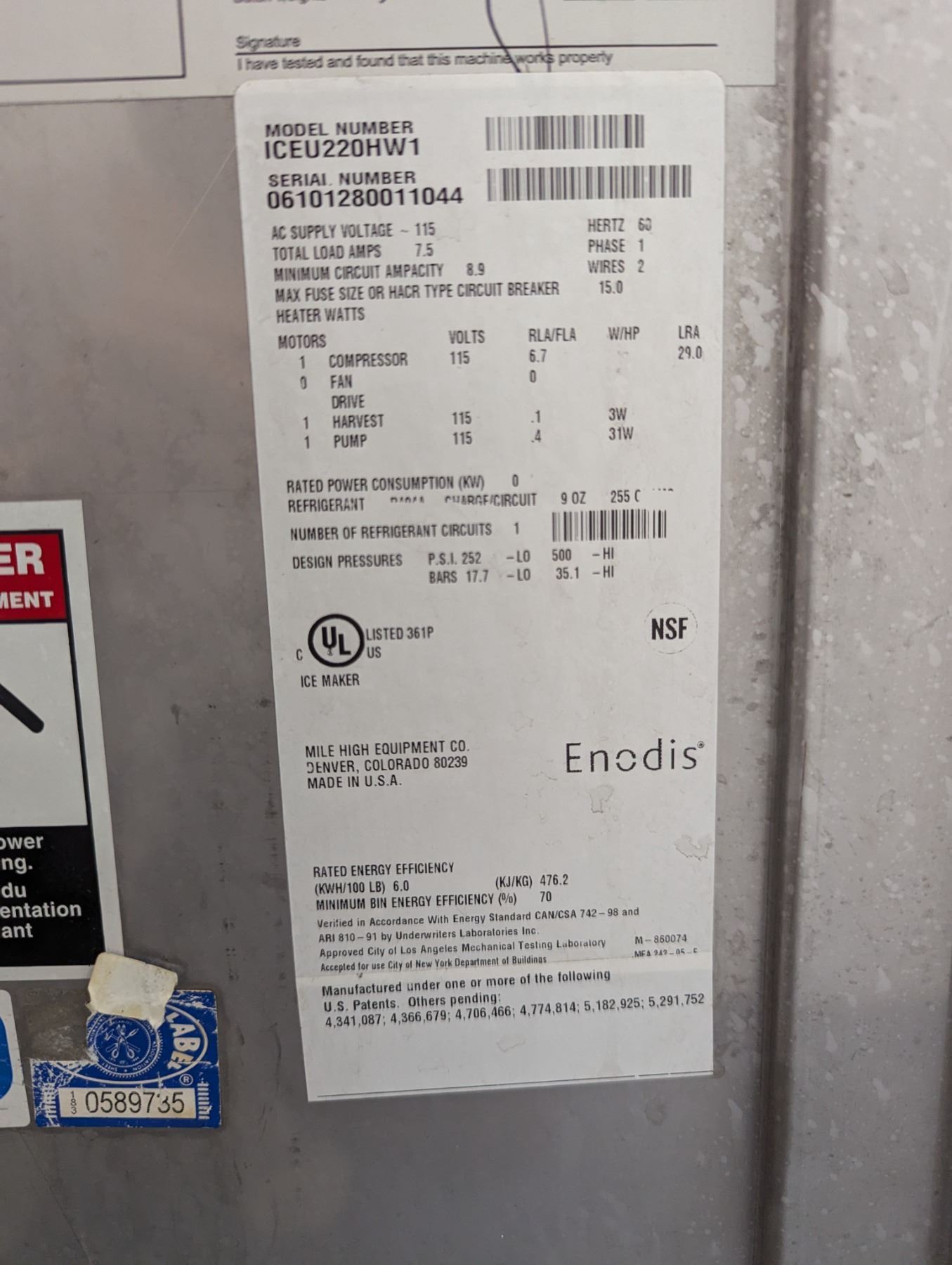 [Used, Tested/Working,] Serial# 06101280011044, 24-1/2" x 26-1/4" x 39", 115V/60Hz/1Ph, Bin Capacity: 70lbs