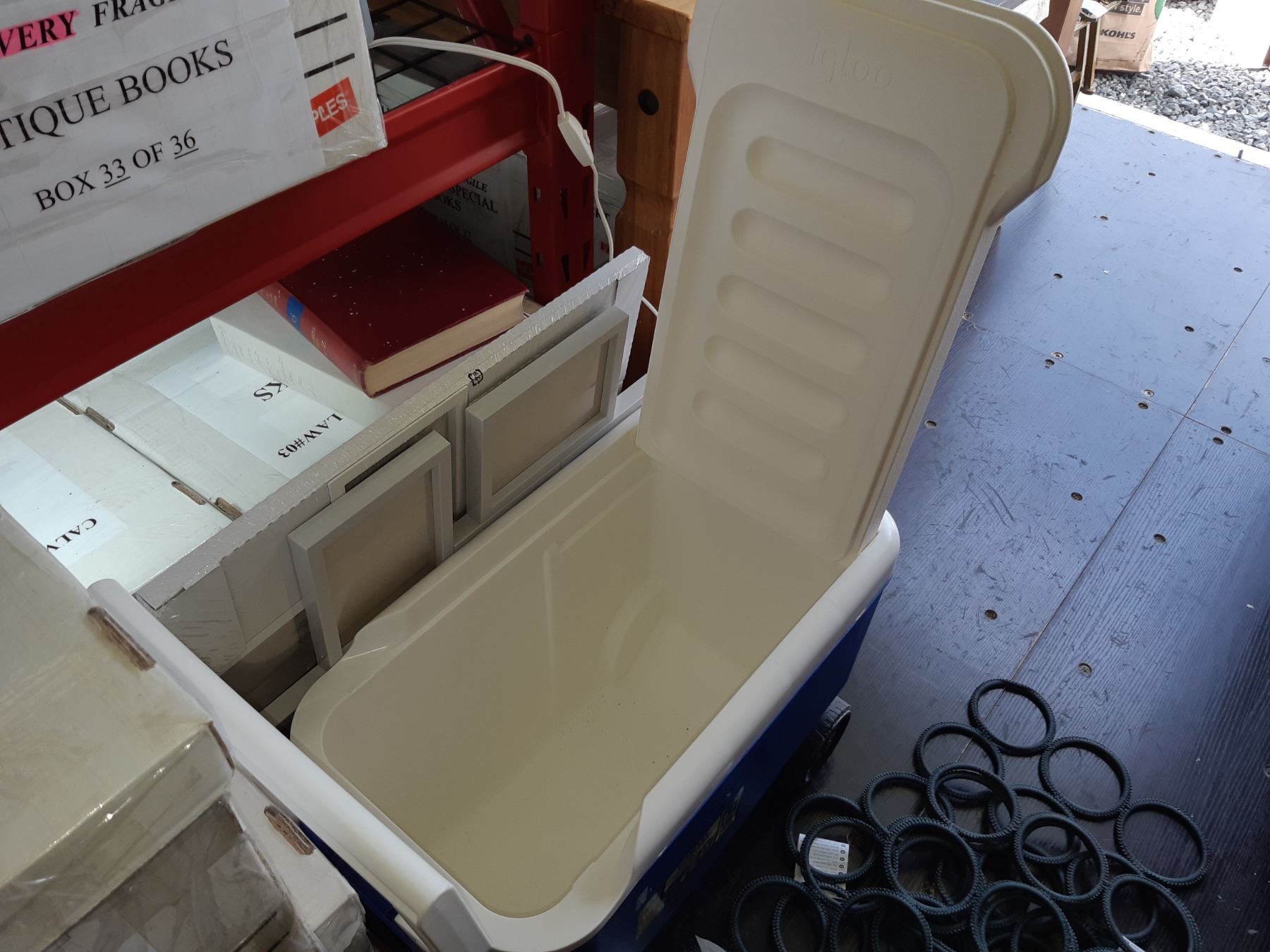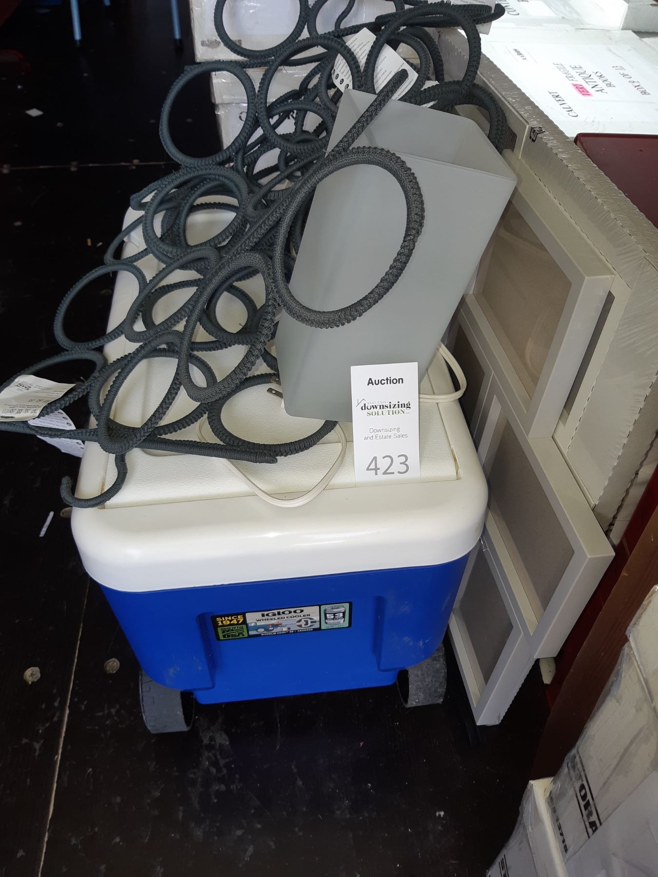 Igloo wheeled cooler, Ikea lamp, scarf holders and 2 x picture frames. Pickup at 10 am