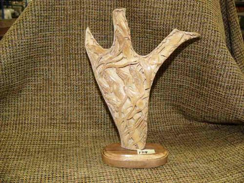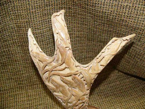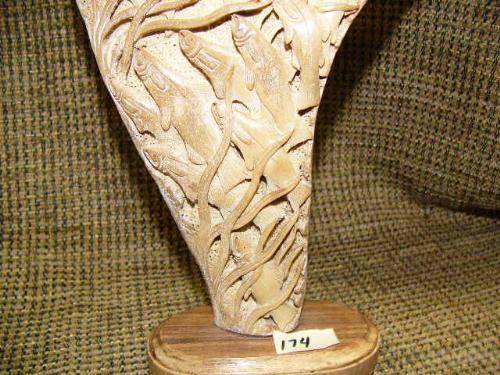 Imported salmon of antler on wood base 9.5" tall, 8" diameter (33)