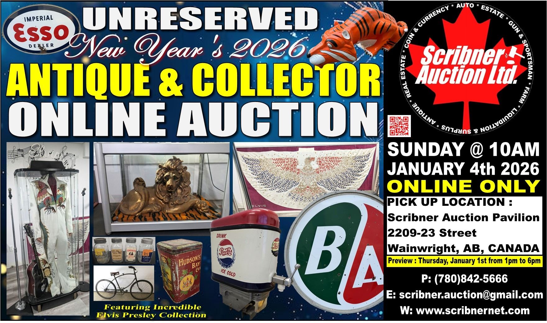 THURSDAY - FRIDAY - SATURDAY - SUNDAY : Purchases will be packaged up after the auction and shipped via Canada Post or PUROLATOR (please let us know which of those 2 Couriers you prefer) within 12-16 days of the auction sale. IF CANADA POST IS ON STRIKE we will be using Purolator. Purolator has offered us great rates competitive with Canada Post in some cases even better depending on location. Please contact us via email (reception.scribnerauction@gmail.com) or call 780-842-5666 prior to the auction if you wish to arrange alternate shipping. Shipping & Handling Charges will be charged to your credit card at the time of shipping. Most packages shipped via Canada Post come with $100 insurance. Please review Canada Post Terms & Conditions & Purolator Terms & Conditions for their respective Insurance Policies. If you want EXTRA Insurance from the carrier, you must instruct our office to purchase additional insurance! Scribner Auction Ltd. will not be responsible for any damage or breakage to any item for any reason (shipping, handling or otherwise). If you wish to arrange for Pick Up at our Wainwright, AB location, please call our office to make an appointment 780-842-5666. You MUST schedule an appointment (NO DROP INS PLEASE!)