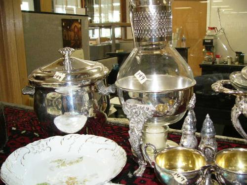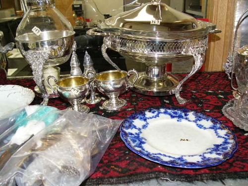 Incredibly lot of: sterling silver creamer and sugar dish, pressed glass butter dish, pressed class cookie jar with small crack, silver plated serving bowl with warmer, silver plated coffee pot with warmer, set of brass silver wear from Thailand, silver plated ice bucket, silver plated salt and pepper shakers, 2 beautiful antique serving bowls, plate with damage (189)