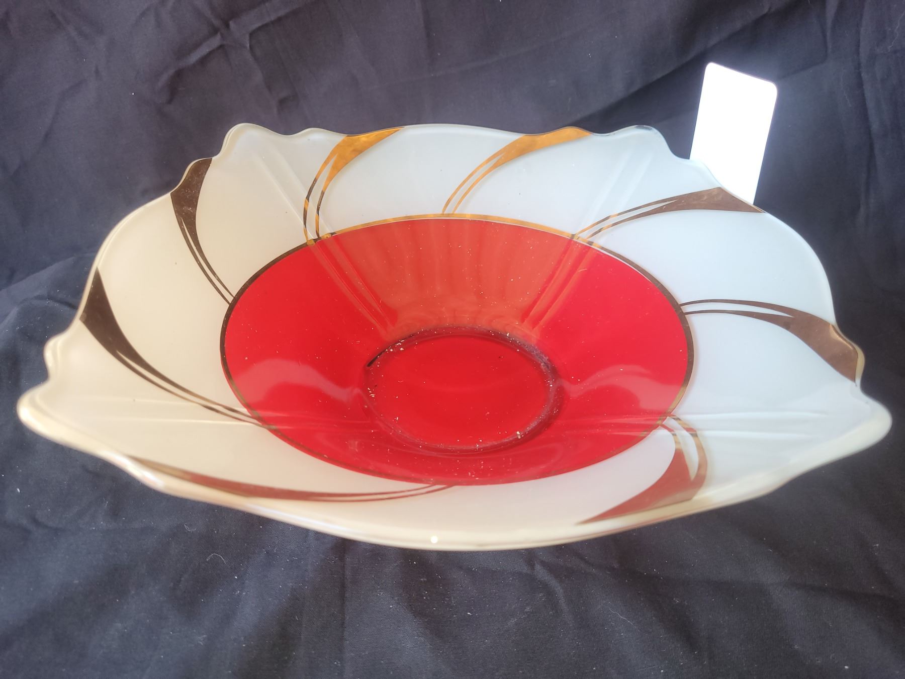 Footed red, gold and milkglass dish 12x12x4" Pickup at 9 am