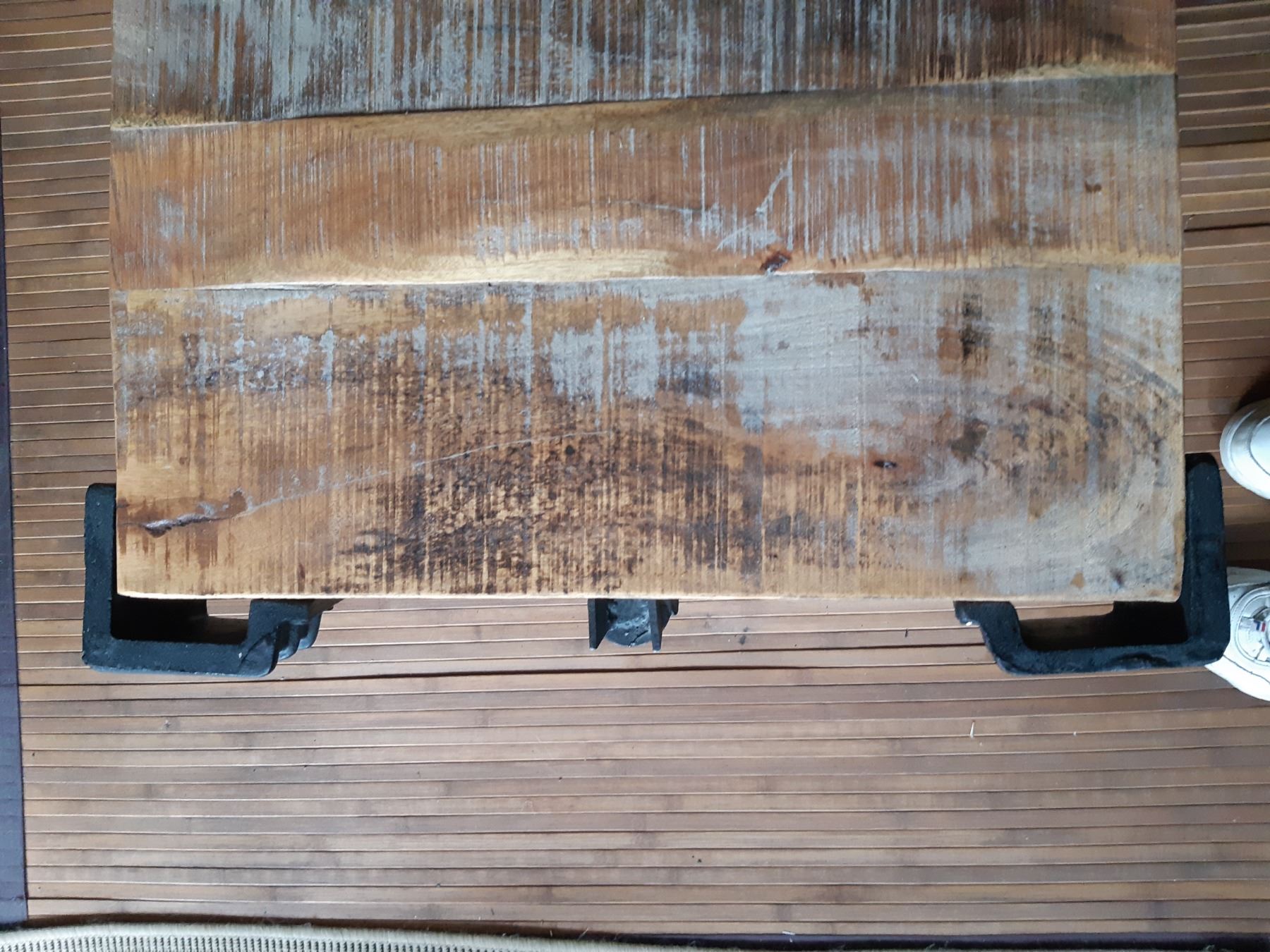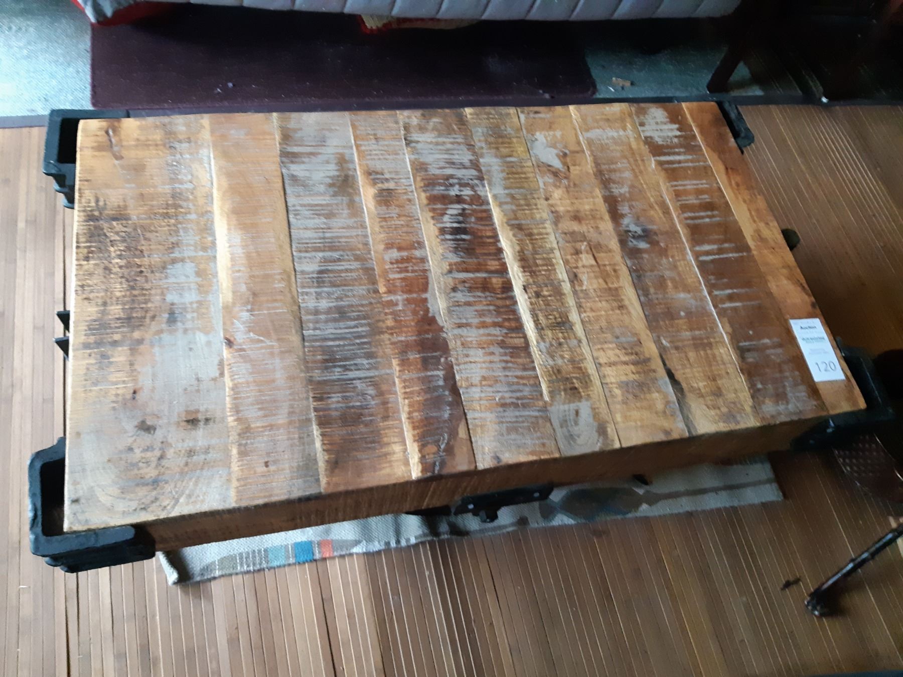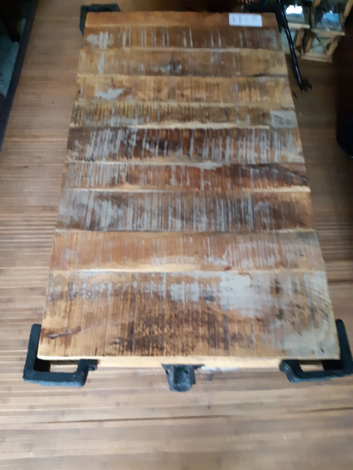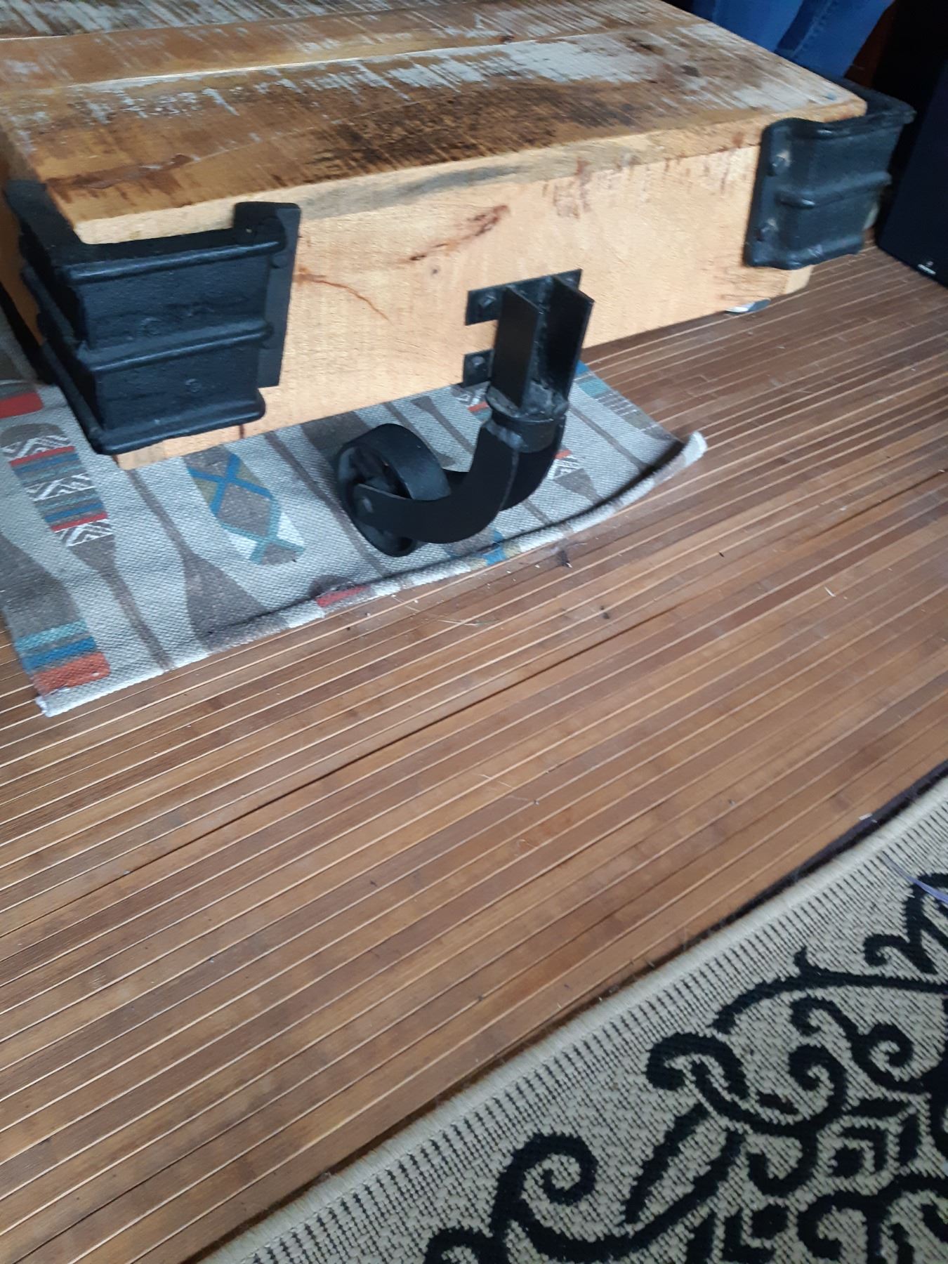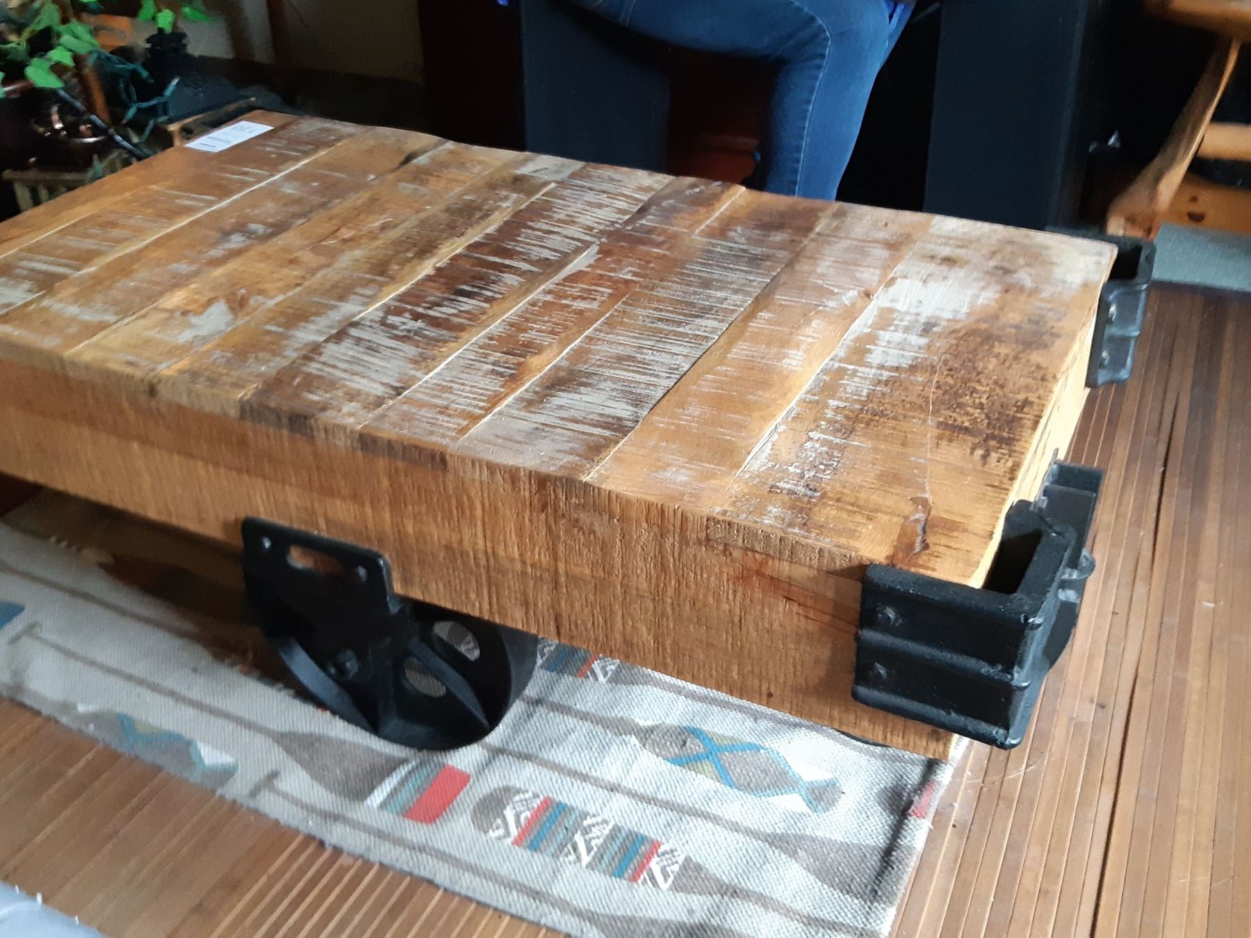 Industrial Cart Wood coffee table with metal wheels and corner accents. 45x26x16. Very heavy table, please bring help to move. Pickup at 11 am.