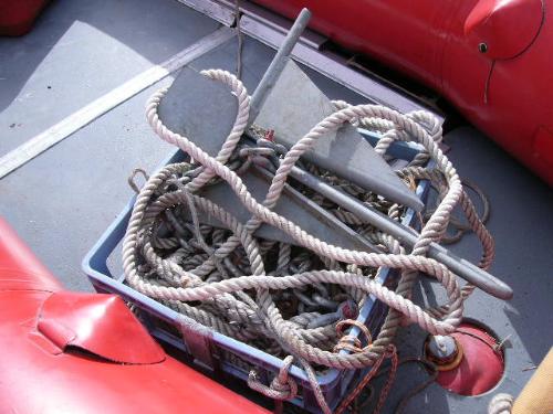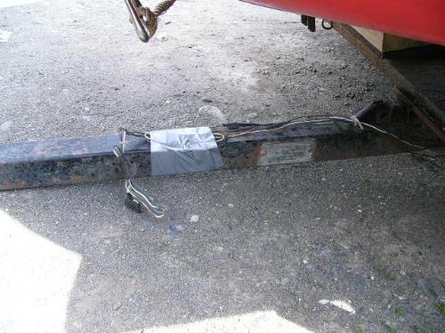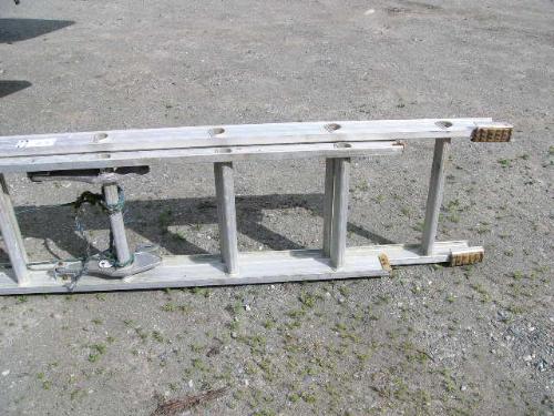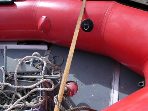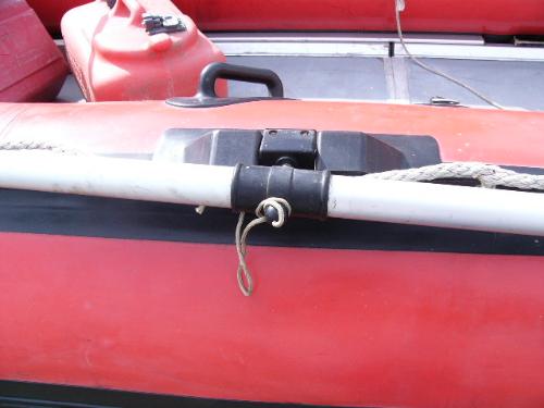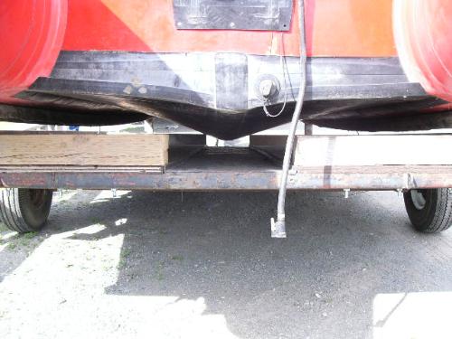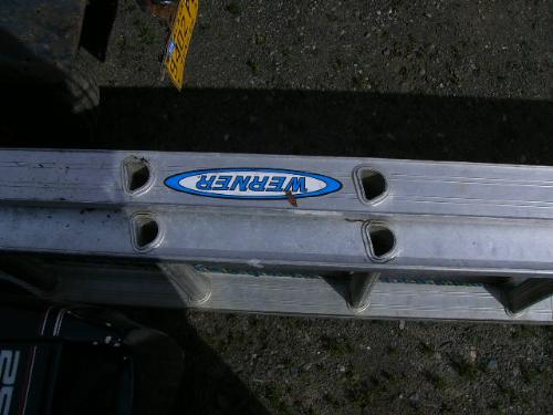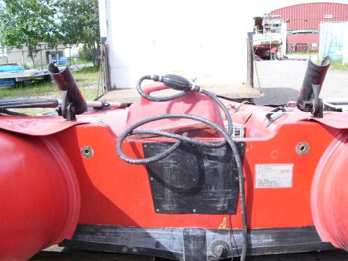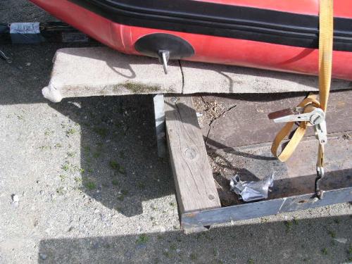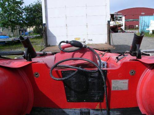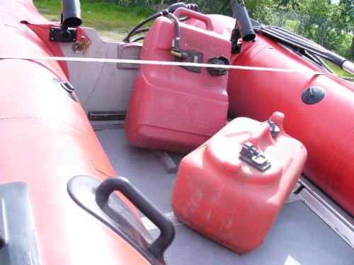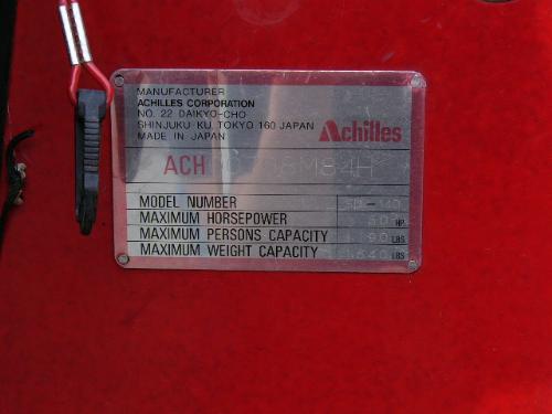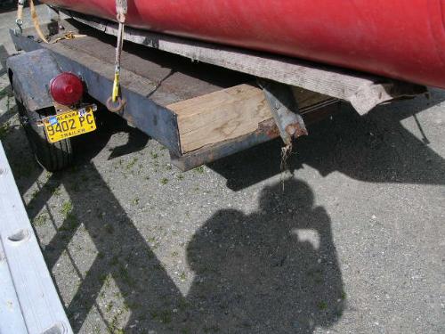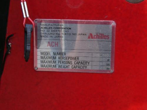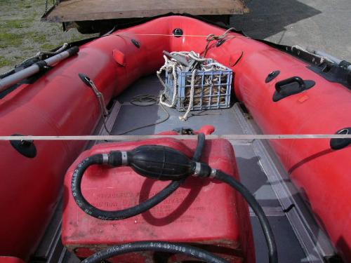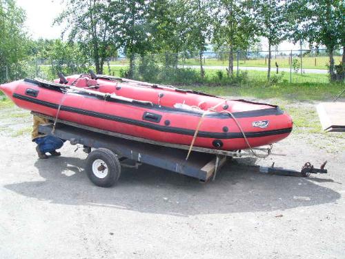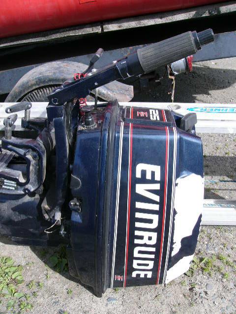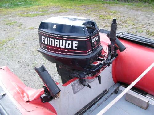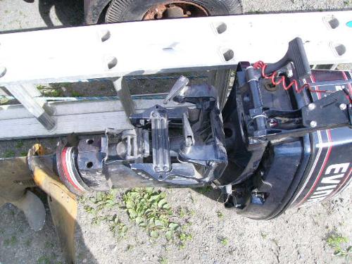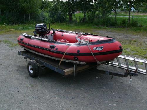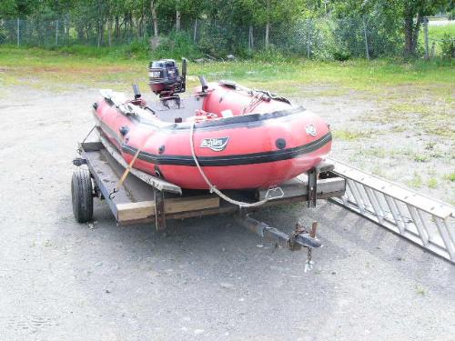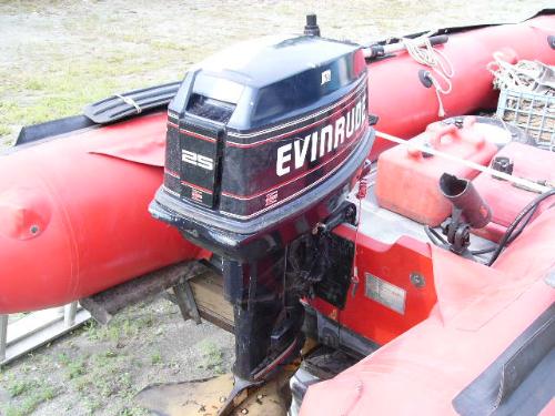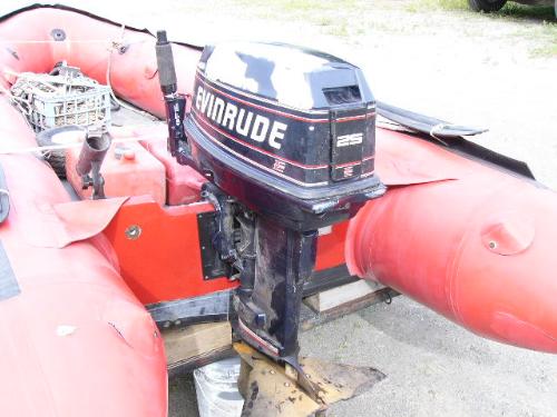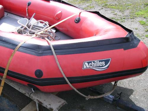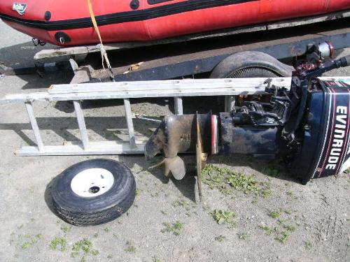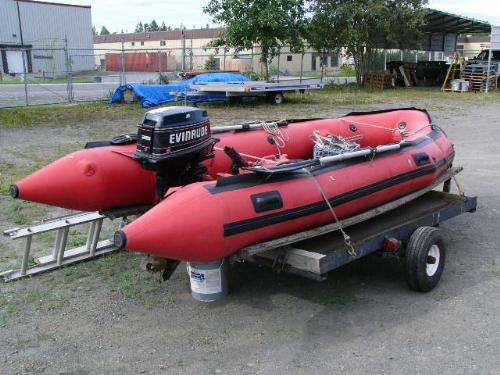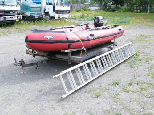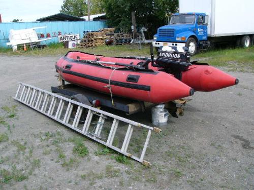 Inflatable Achilles skiff with trailer, 25hp Evinrude, anchor, oars, 2 gas jugs, fishing pole holders and Werner metal ladder ()