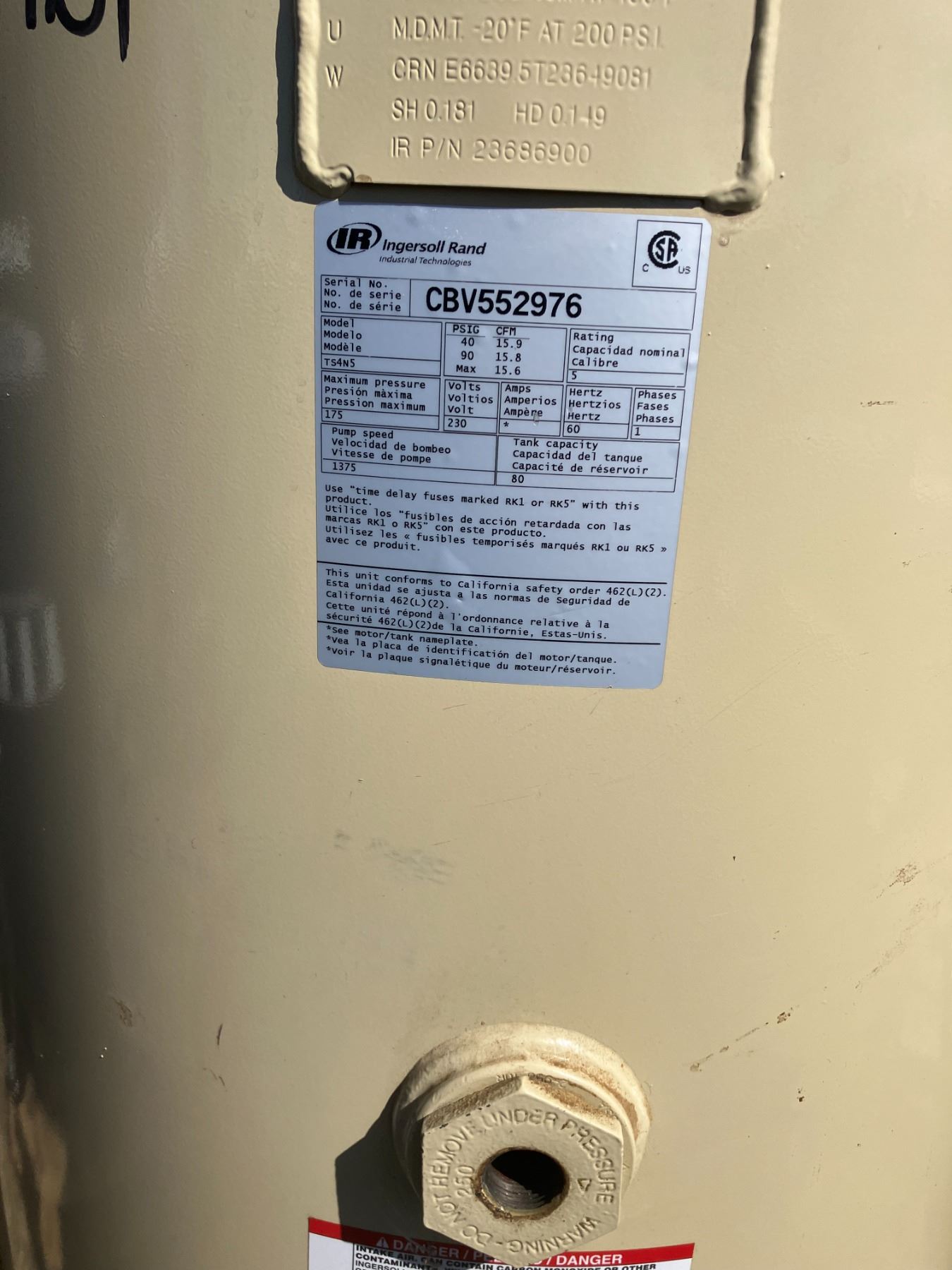 Ingersol Rand 80 gal air compressor. 220 volt.