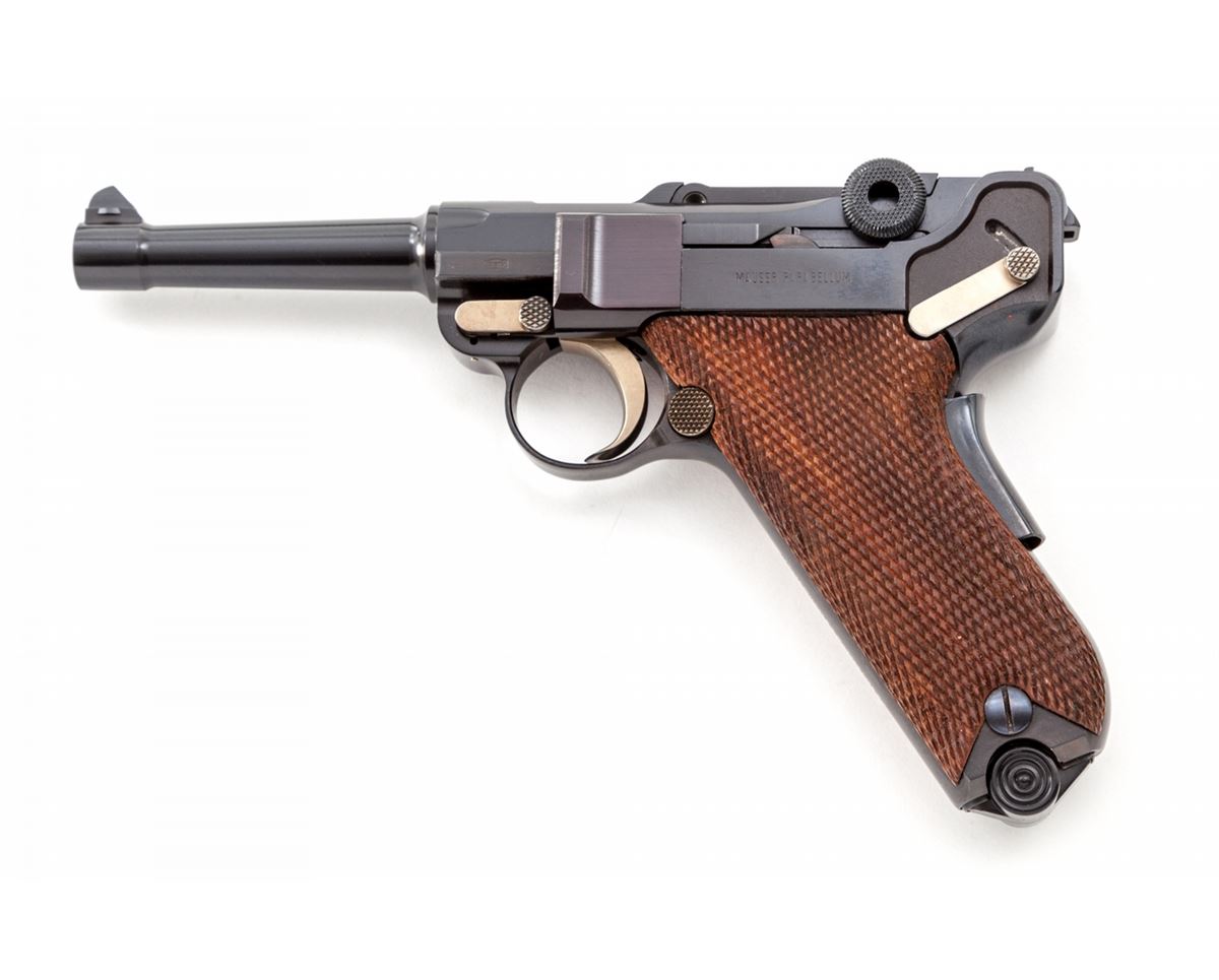 Interarms Original Mauser American Eagle Luger, #11.007996, 9mm, 4'' barrel, blue finish with straw small parts, checkered walnut grips, with one original magazine. ''Original Mauser'' Banner stamped on top of toggle, with American Eagle motif to chamber area; Swiss frame, Interarms marking on right side of receiver, with all matching numbers. Condition is excellent, appearing as new and unfired, with no box or instructions. Est.: $1,000-$1,500. (Modern/PPT) (John Siroonian estate)