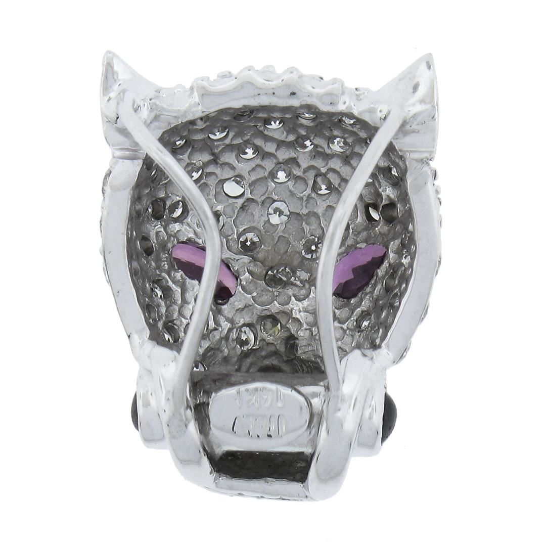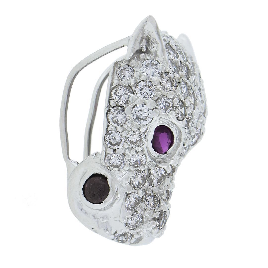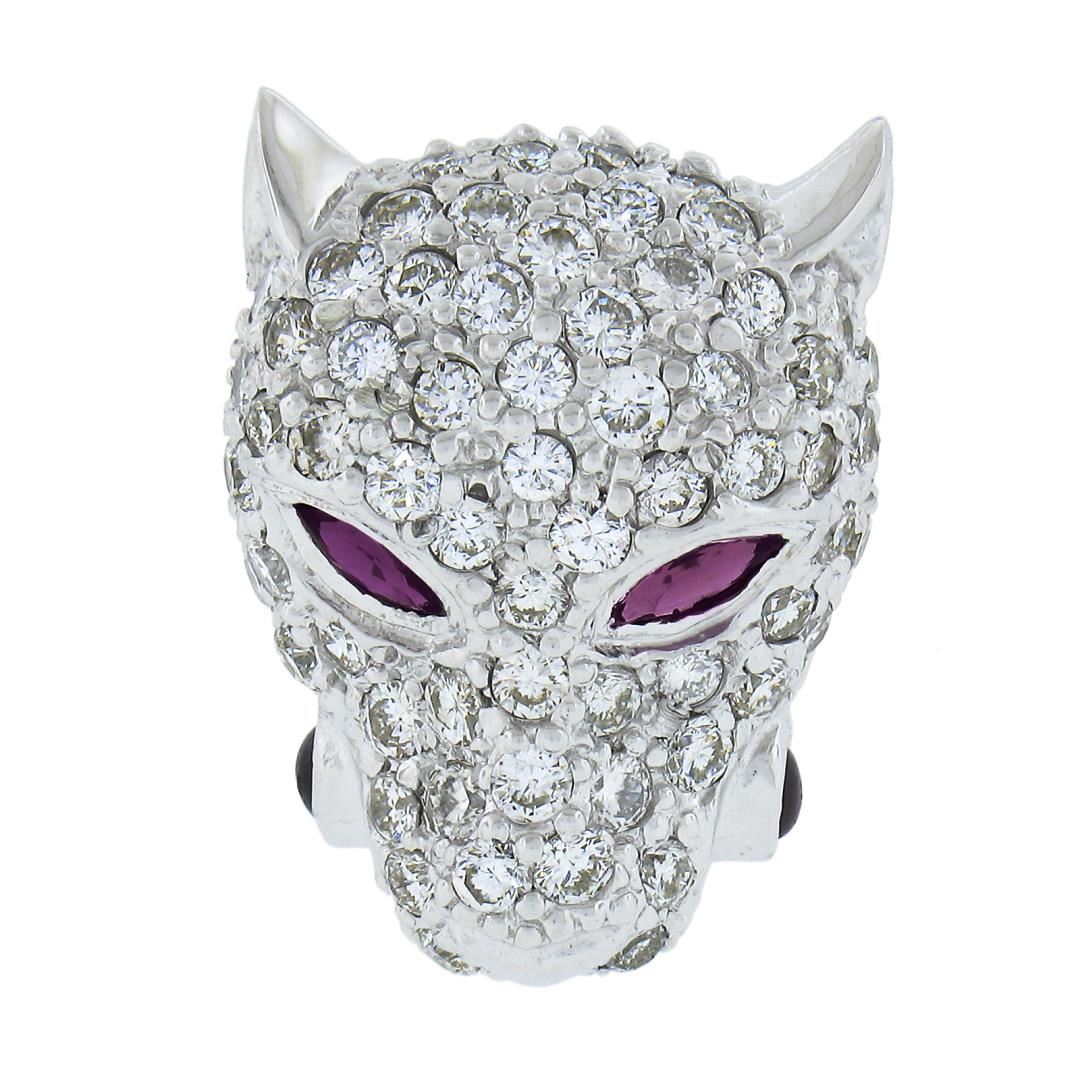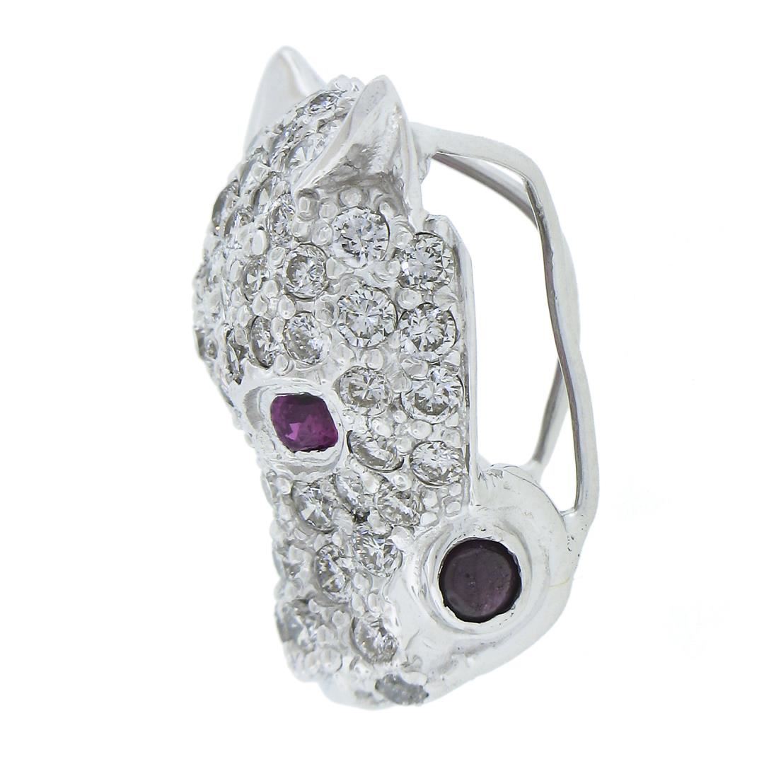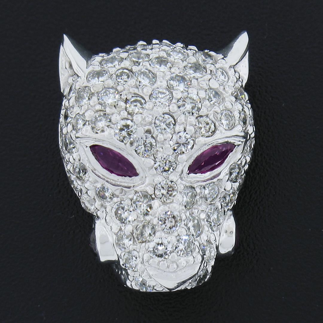 A solid italian 14k white gold panther face slide pendant, featuring numerous of round cut natural diamonds (G-I - VS1-SI2 ; 2ctw), and 2 marquise cut 2 round cabochon cut natural rubies (0.30ctw). The pendant weighs a total of 7.09 grams, measures 21.8x16.7mm including the bail, and the inside of the bail measures 12.5x4.5mm.