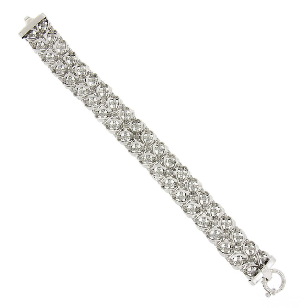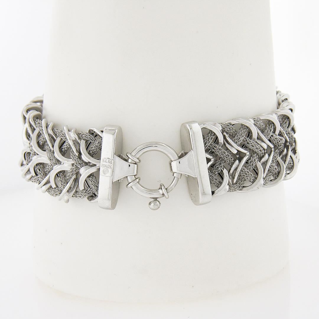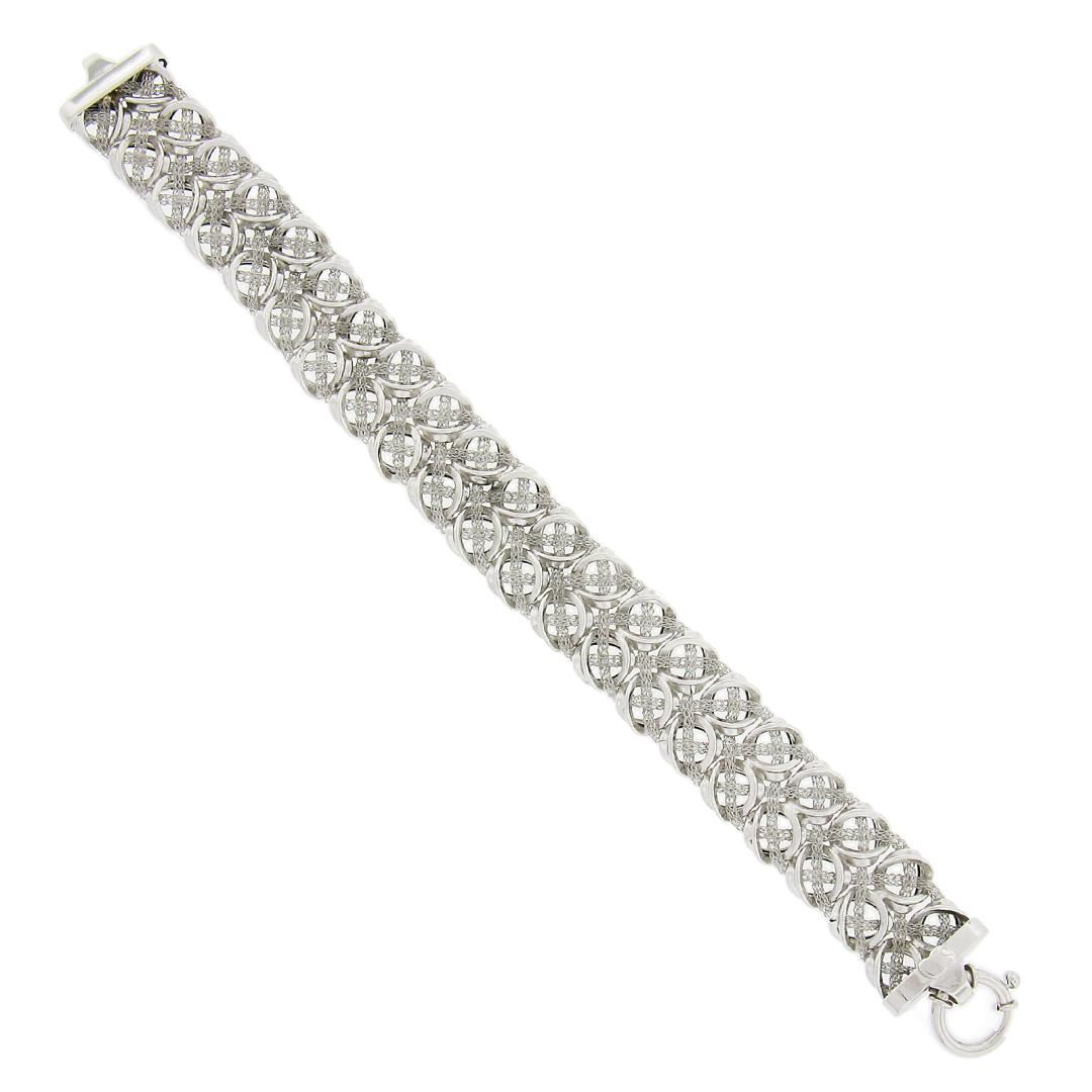 A solid 14k white gold italian wide strap bracelet. It weighs a total of 14.50 grams, measures 16.8mm wide, and measures 7.5 inches in length.