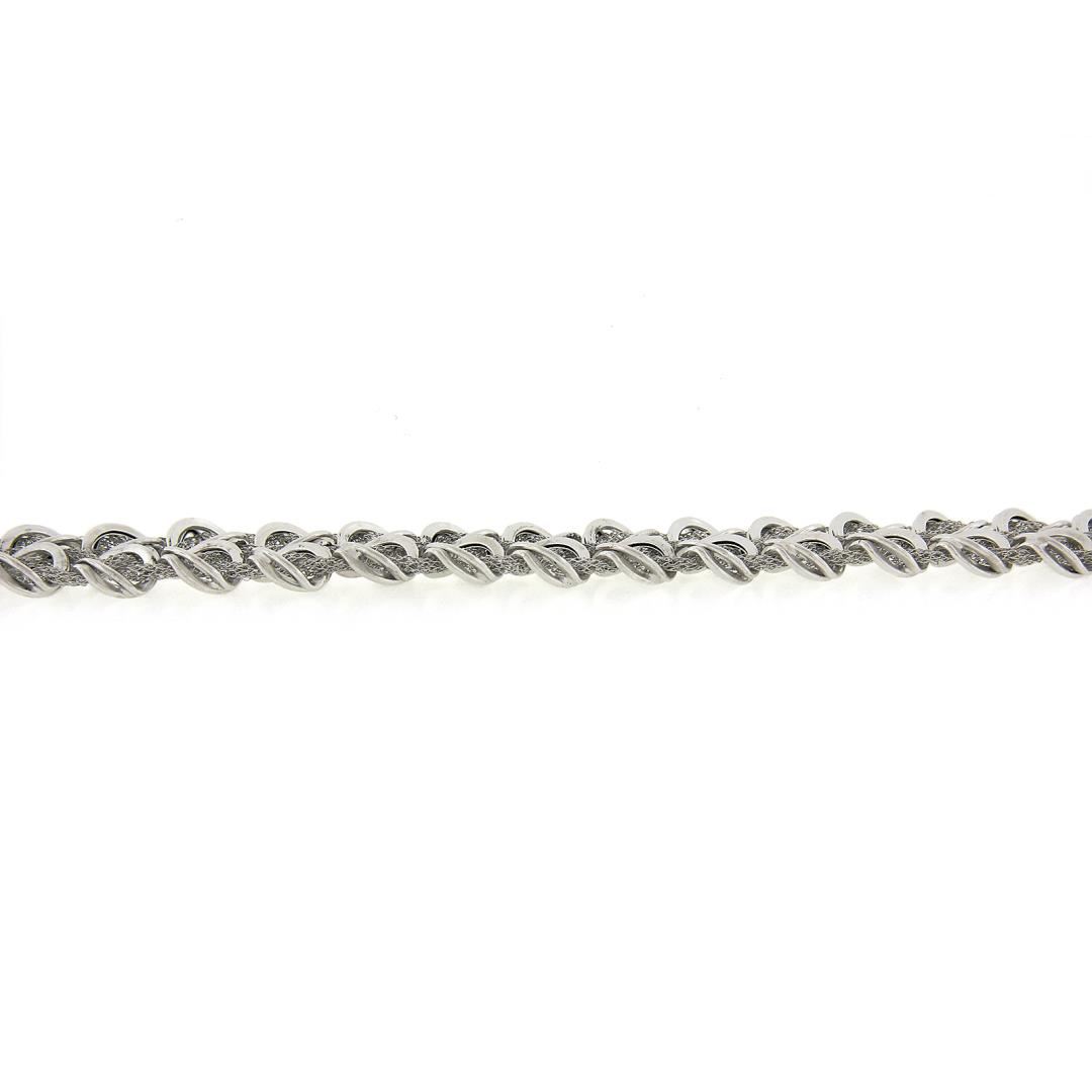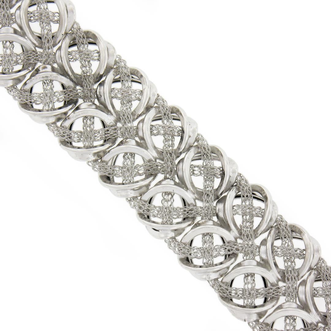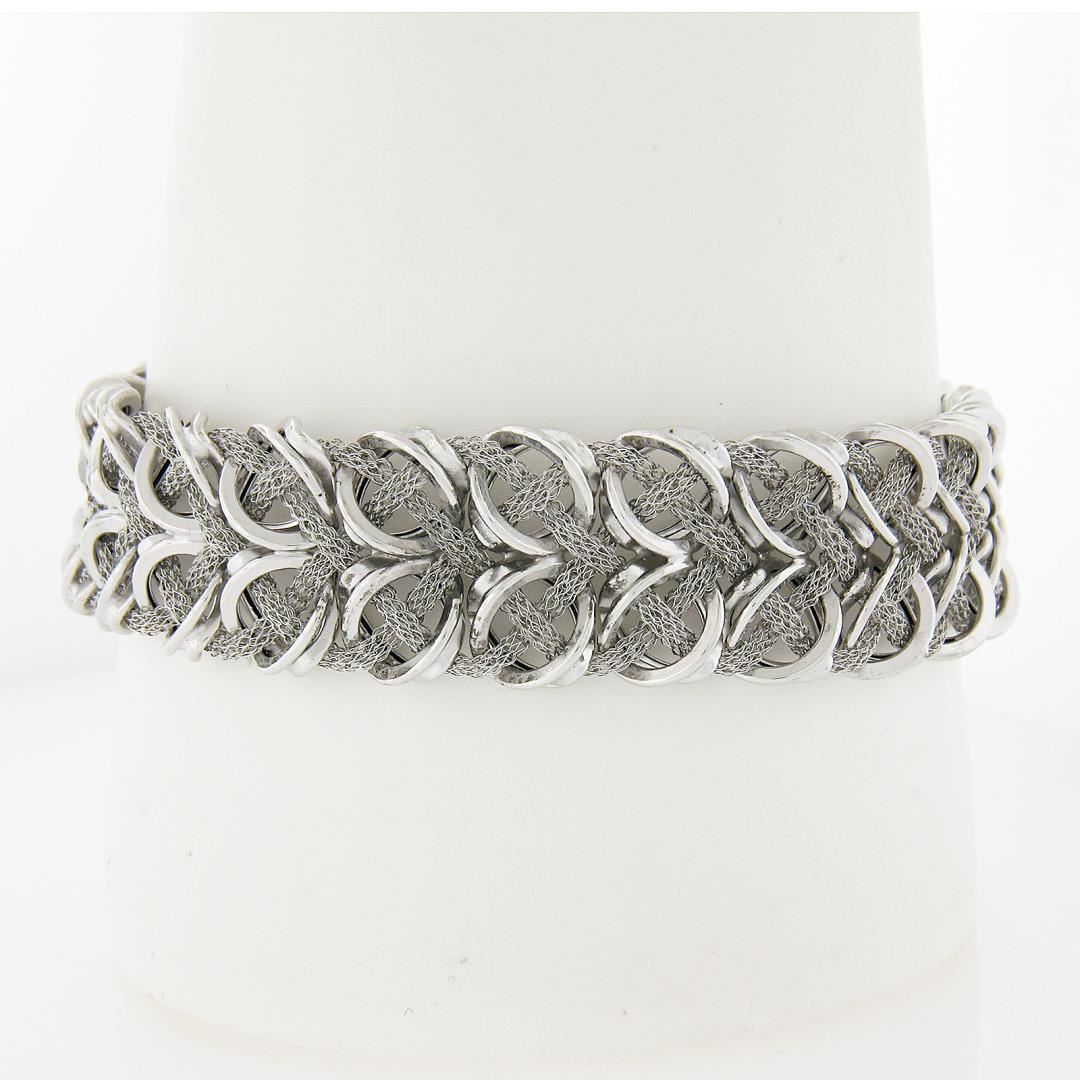 A solid 14k white gold italian wide strap bracelet. It weighs a total of 14.50 grams, measures 16.8mm wide, and measures 7.5 inches in length.