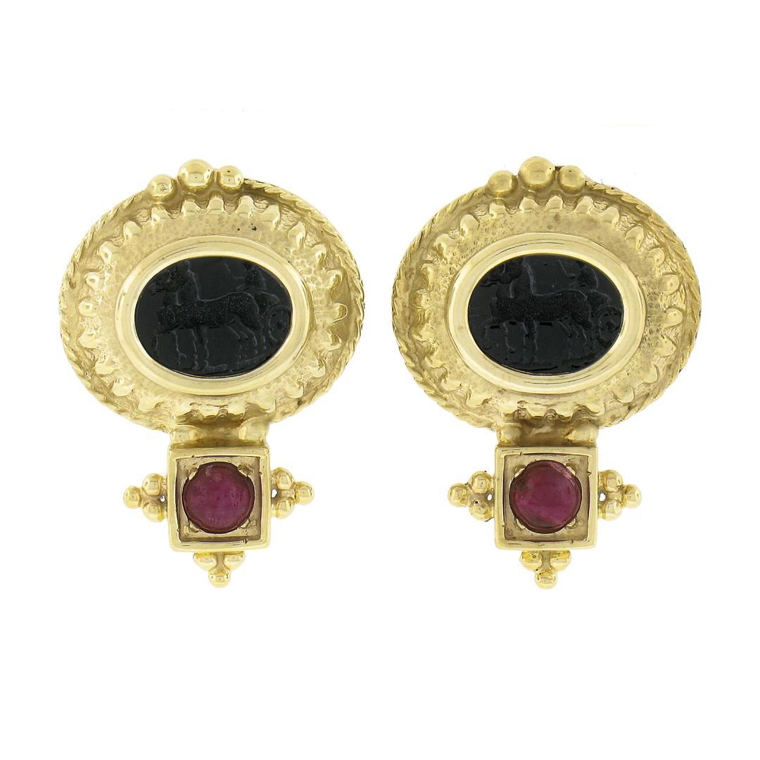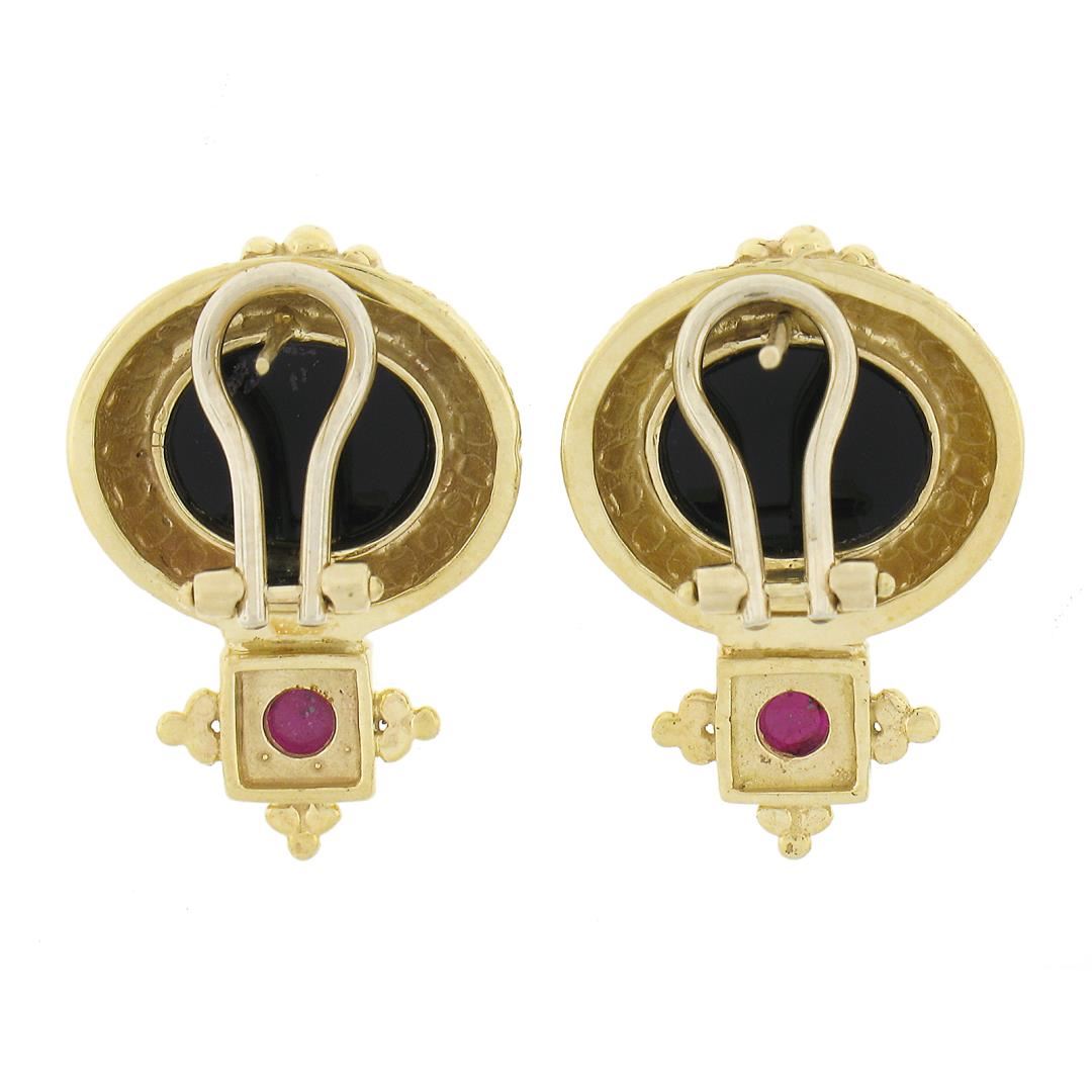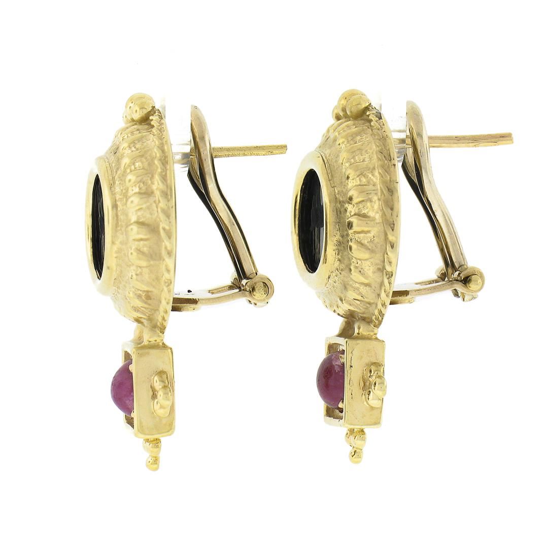 A solid 14k yellow gold drop earrings, with 2 oval intaglio natural black onyx (8.8x6.9mm each ), and 2 round cabochon cut natural rubies (4mm each). The earrings measure approximately 25.5x18.1mm and weigh a total of 10.17 grams.