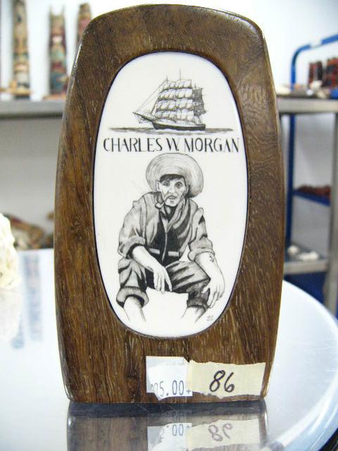Ivory scrimshawed Charles W. Morgan sailing ship and sailor in wood- 5-1/2" high scrimshawed by L. A. ()