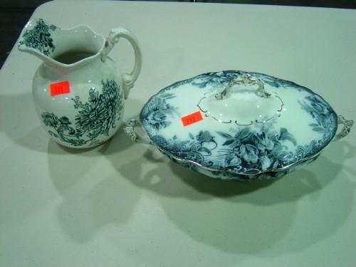 J&C MEAKIN ENGLAND COVERED CASSEROLE DISH WITH CHIP ON INSIDE OF LID AND BUFFALO POTTERY MILK PITCHER