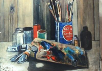 J. K. HANSEGGER 470 OIL ON CANVAS STILL LIFE PALLETTE, PAINTS AND BRUSHES 30"X24"