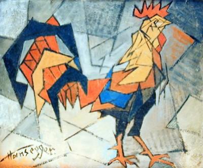 J.K. HANSEGGER 477 O/B ROOSTER IN TRIANGLE 16"X13.5" (FRAMED)