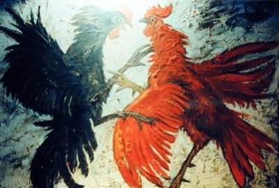 J.K. HANSEGGER 484 O/C COCK FIGHT 50"X38" (FRAMED)
