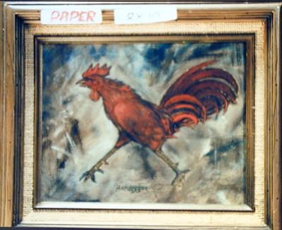 J.K. HANSEGGER 498 O/C RED ROOSTER 9"X7.5" (FRAMED)