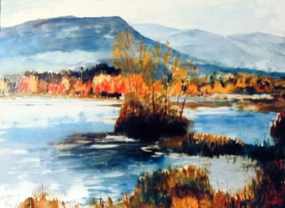 J.K. HANSEGGER 634 O/P AUTUMN LANDSCAPE W/ WATER 28"X22" (FRAMED)