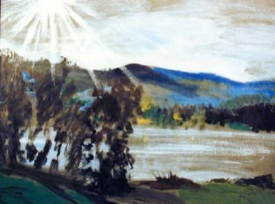 J. K. HANSEGGER 675 OIL ON PAPER BLACK TREES WITH SUNRAYS 24"X30"