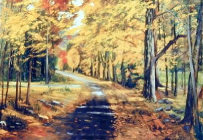 J K HANSEGGER 735 OIL ON CANVAS PATHWAY THROUGH AUTUMN WOODS 30"X24"