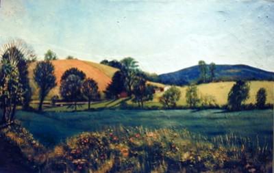J. K. HANSEGGER 769 OIL ON CANVAS GREEN HILLS WITH BARN 37"X24"