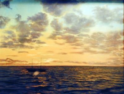 J. K. HANSEGGER 875 OIL ON BOARD OCEAN SUNSET WITH TWO MASTED SHIP 24"X30"