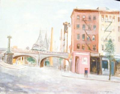 J. K. HANSEGGER 916 OIL ON CANVAS STREET SCENE WITH BRIDGE 30"X24"
