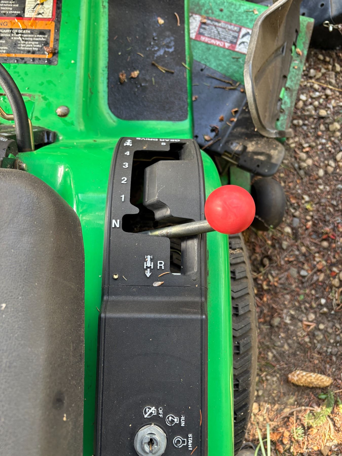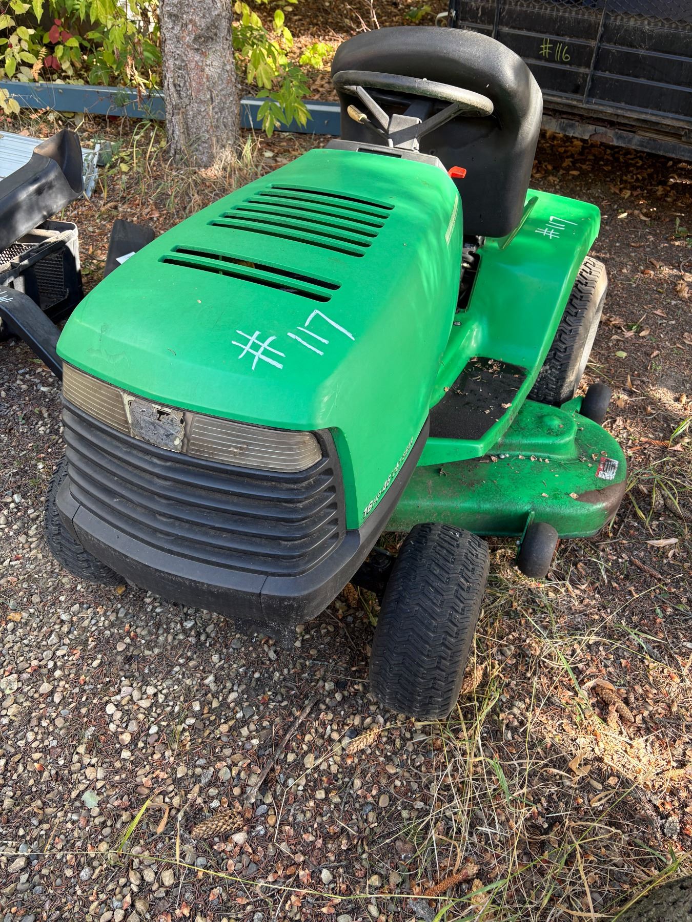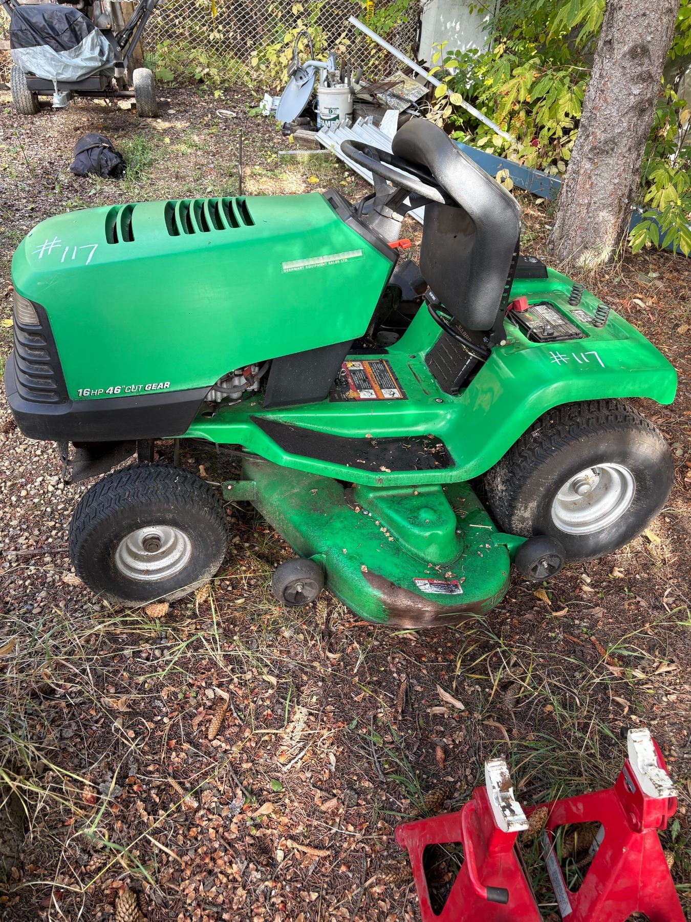 JD 16 H.P 46" riding mower. GXSABRT010037 c/w rear bagger. Running.