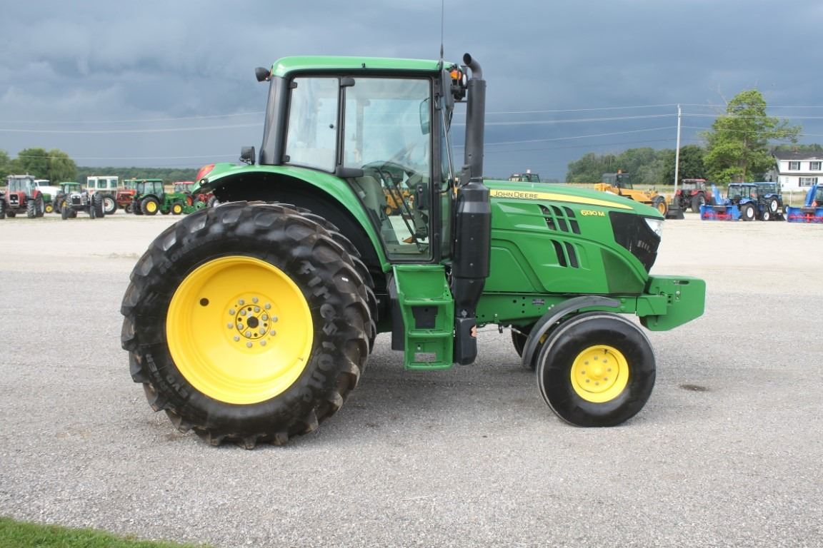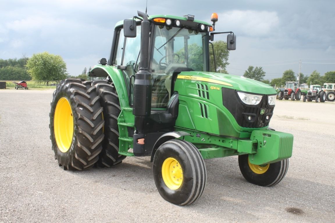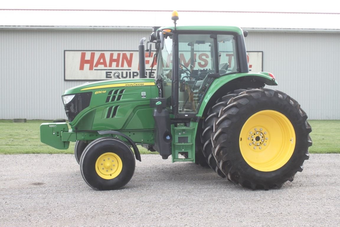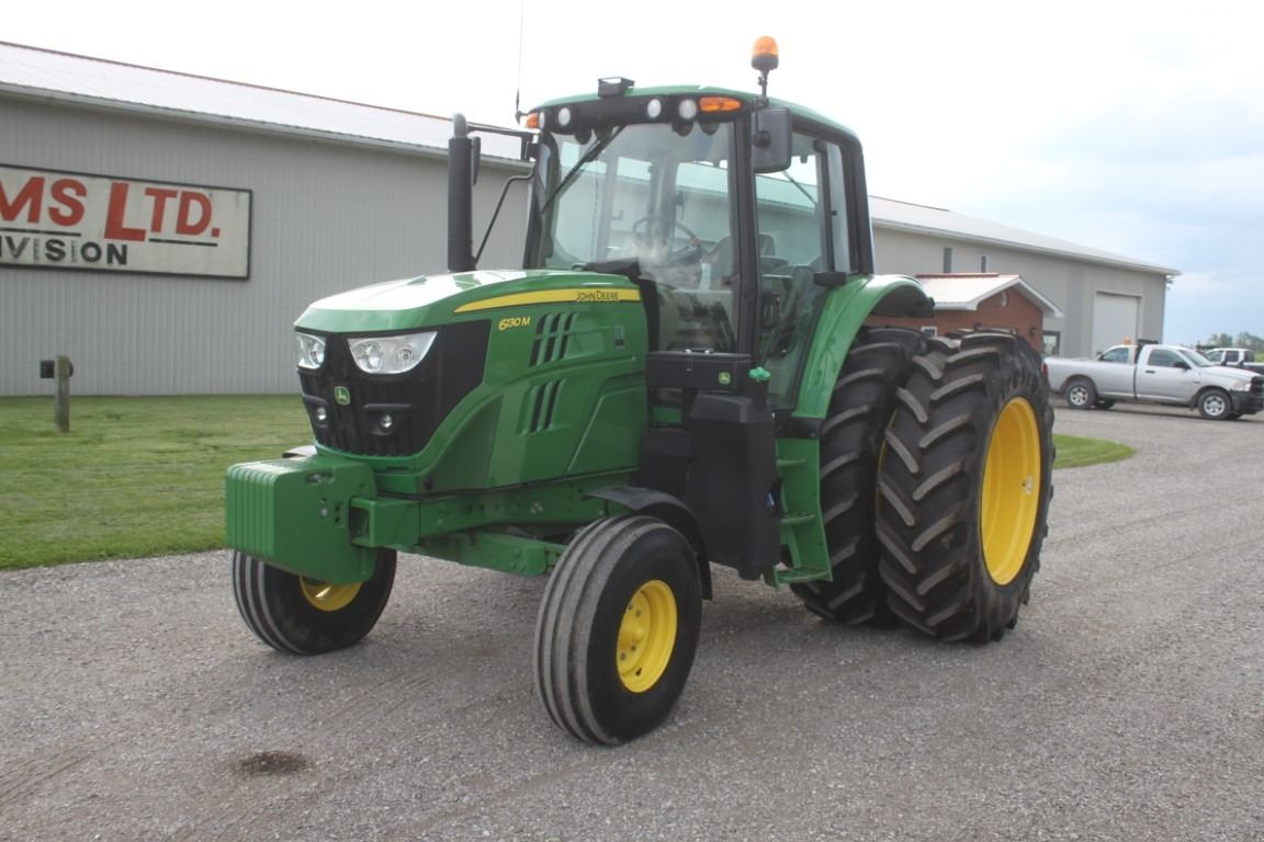 JD 6130M 2wd tractor, cab, air, power quad, 3 remotes, 18.4x38 axle duals, 8 front weights, 860 hours, cab mount for guidance receiver, one owner