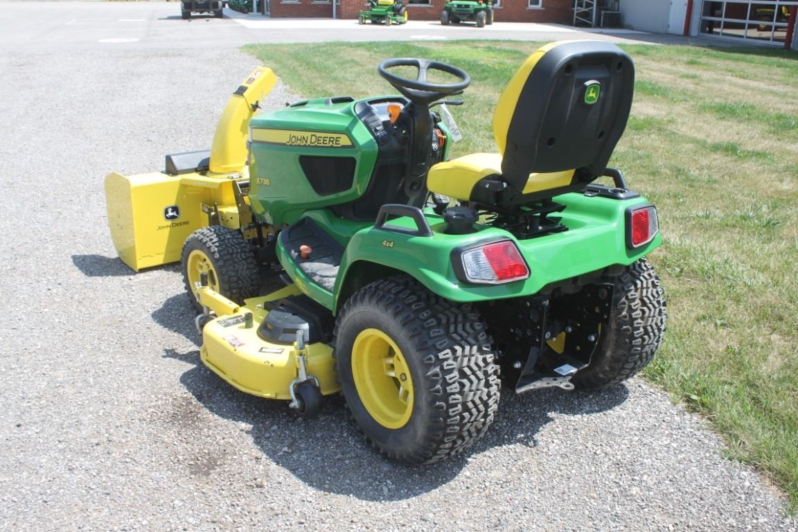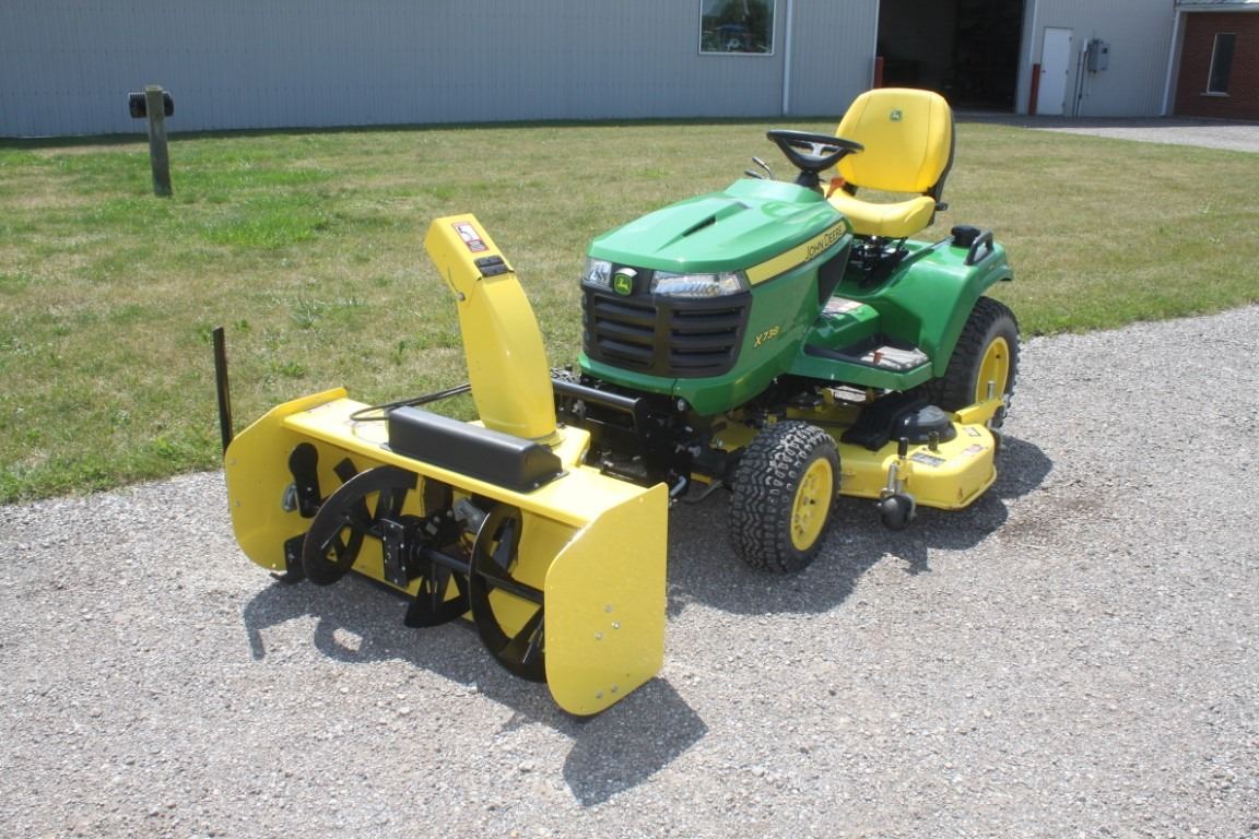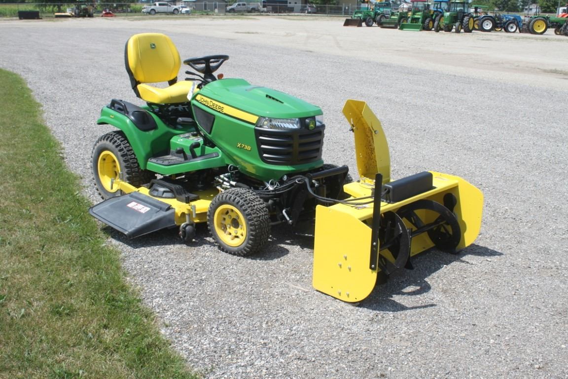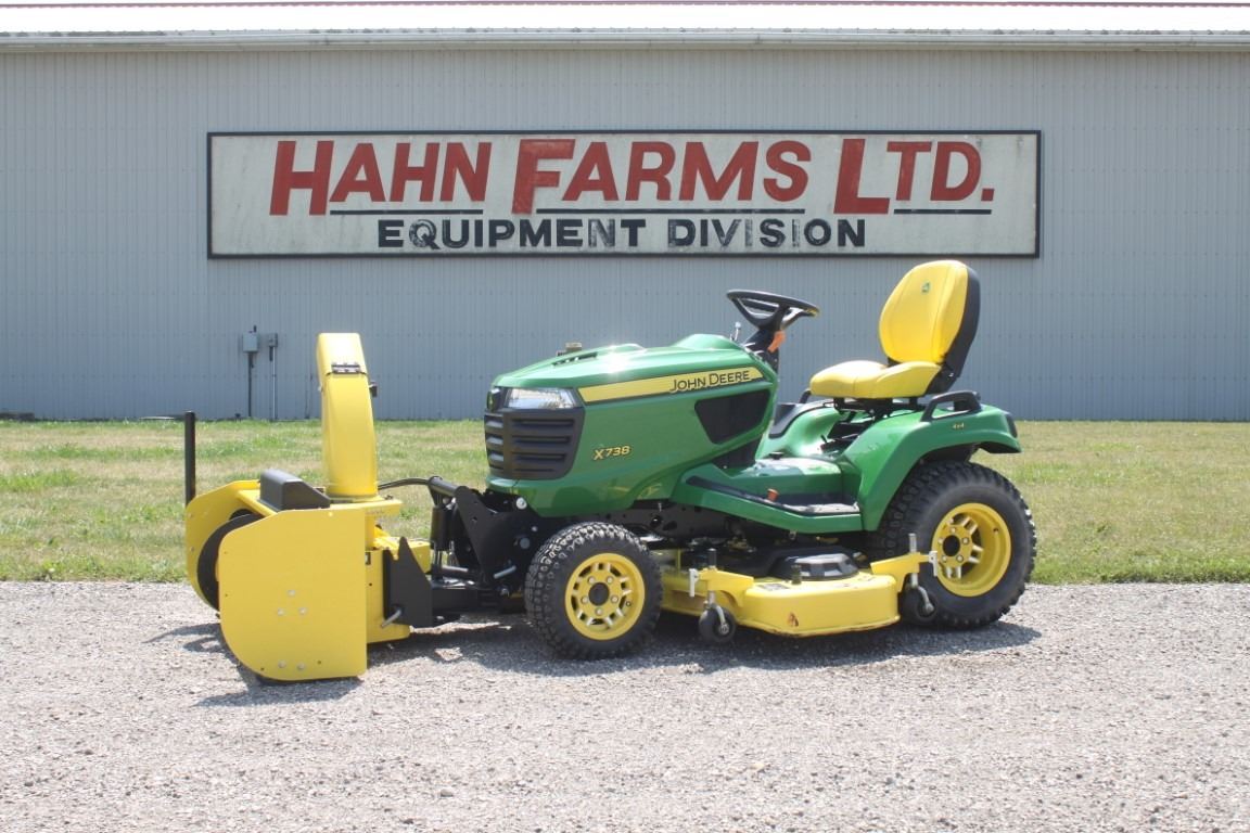 JD X738 4wd lawn tractor, JD high capacity 60" Drive Over deck, deluxe seat, JD front mount 47" snowblower, shaft drive, 31 hours, 2020 model