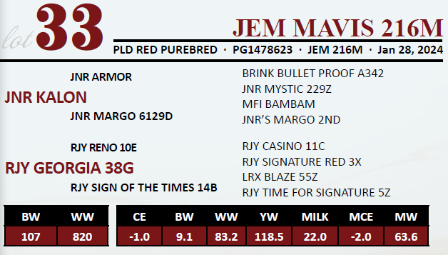 JEM MAVIS 216M - Polled - Exposed from March 10 - June 1 to JNR Quote middle of January calving.