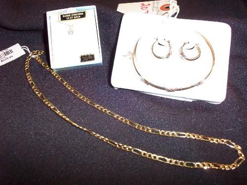 GOLD EARRINGS, BRACELET, AND NECKLACE