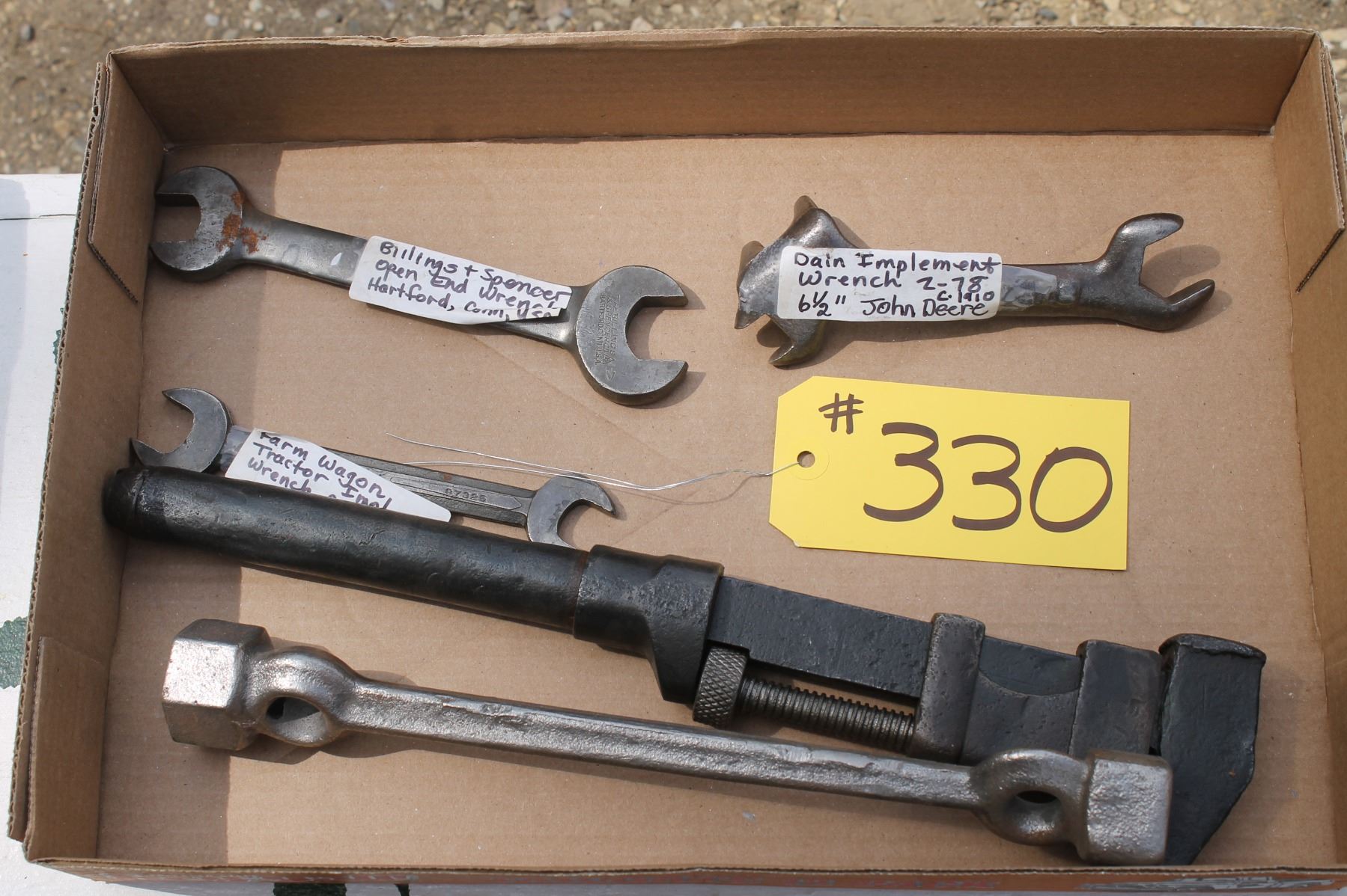 JOHN DEERE DAIN IMPLEMENT WRENCH,BILLINGS & SPENCE OPEN END WRENCH, BOX WRENCH, LARGE CRESCENT WRENCH, FARM TRACTOR IMPLEMENT WRENCH