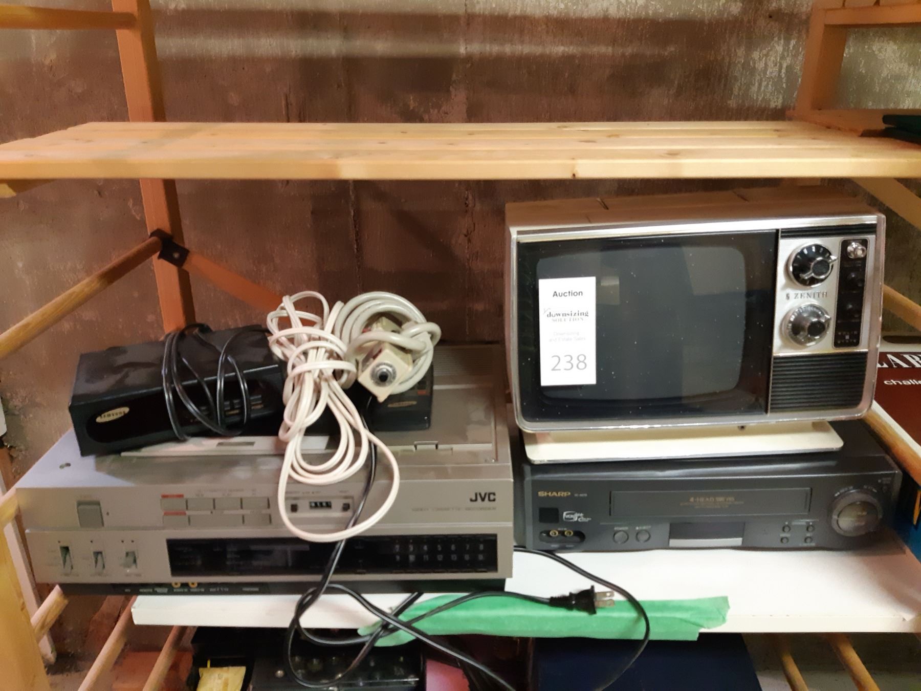 JVC video cassette recorder, SHARP 4 head VCR, Samsung radio & ZENITH vintage TV, extension cords. All untested. Cat B.