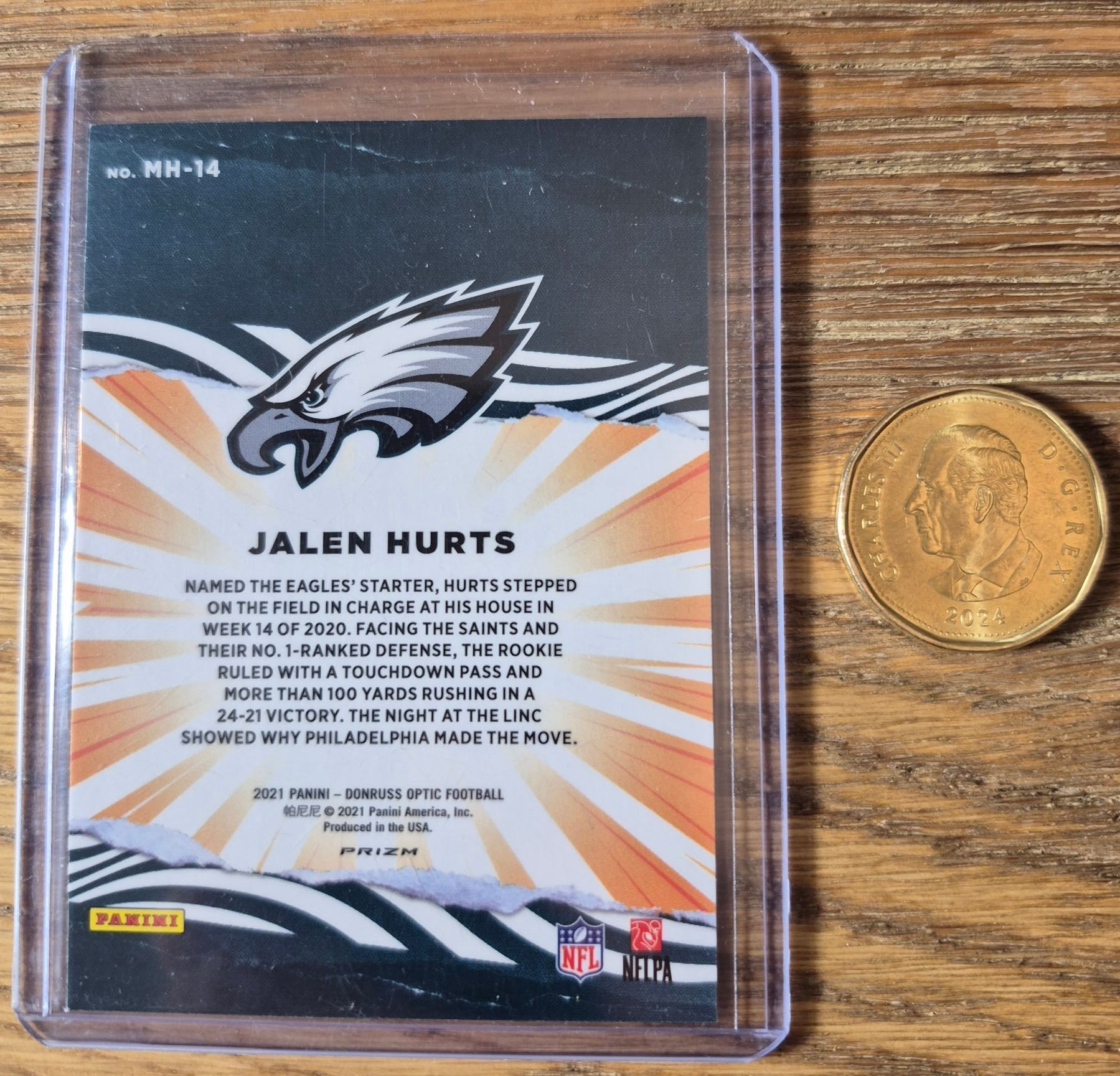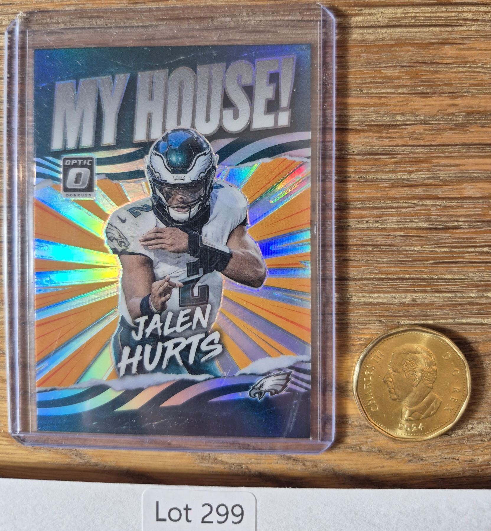2021 Panini Donruss Optic 'My House!' insert card featuring Philadelphia Eagles QB Jalen Hurts. Vibrant holo refractor background with bold design.