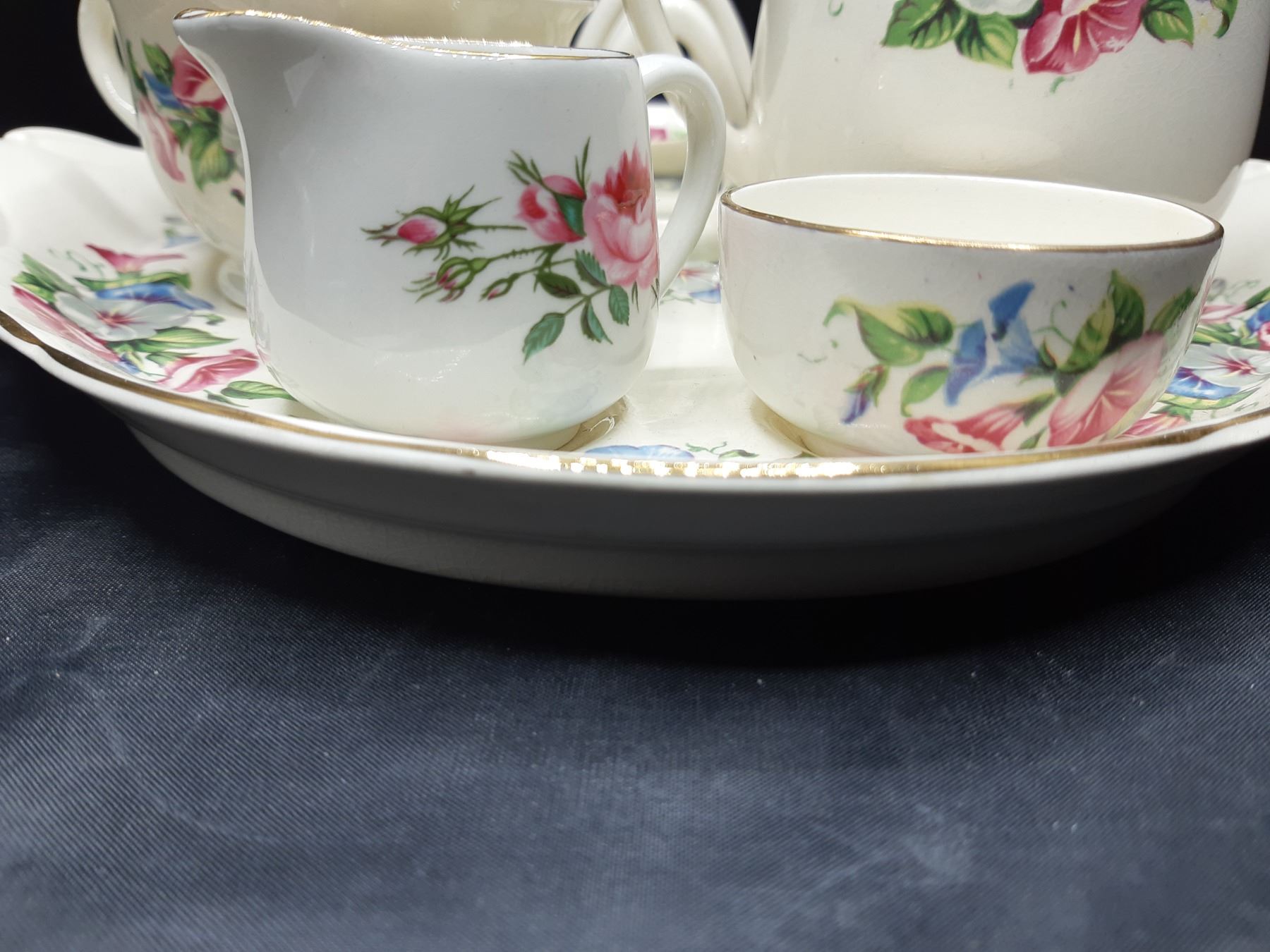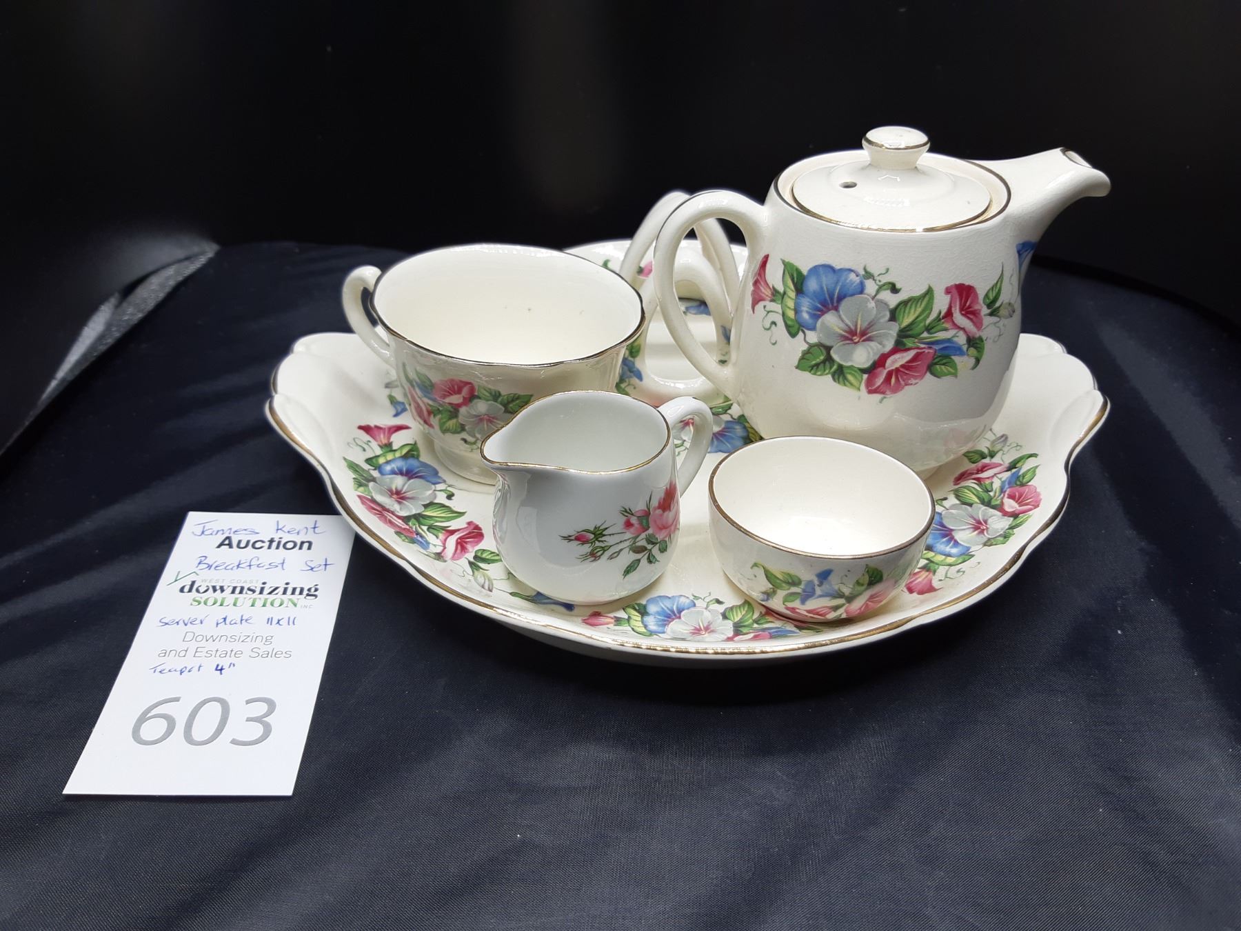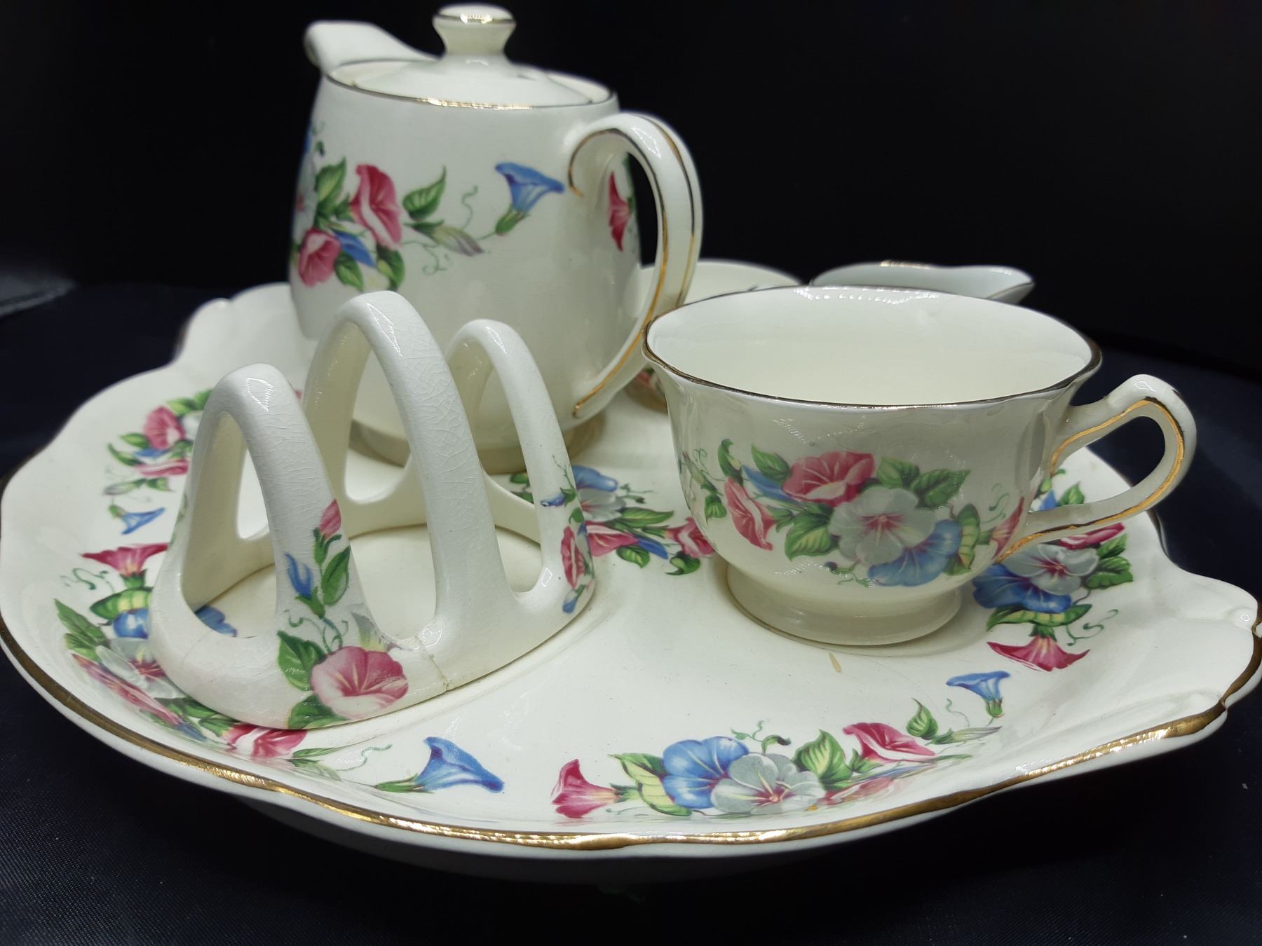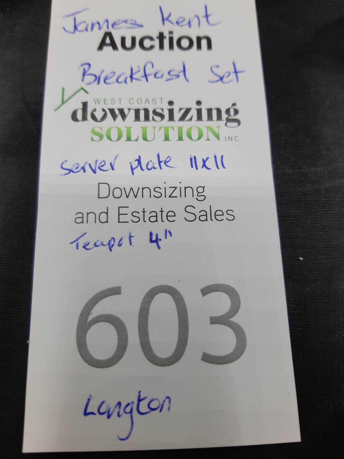 Server tray 11x11, teapot 4", toast rack, cup and cream & sugar. Bring packing materials and pickup at 9 am