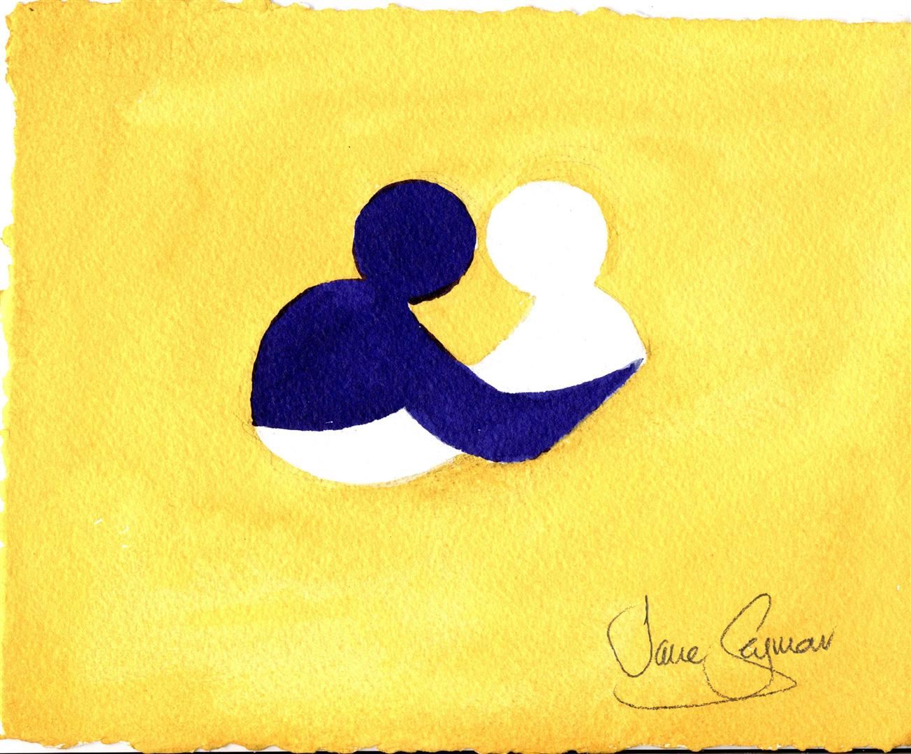Jane SEYMOUR ORIGINAL: Kindness Campaign - Caring III. (yellow and purple). Watercolor on paper, signed lower right, 8 x 10" Tender illustration of human kindness and caring created for Jane SEYMOUR ORIGINAL's Open Heart "Kindness Campaign" designed for jewelry.