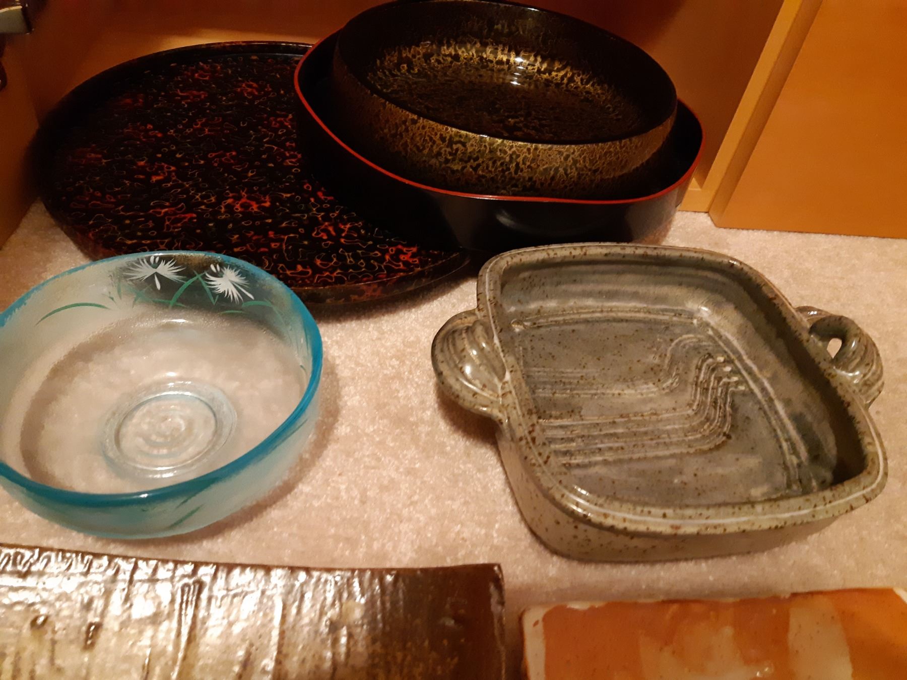 Pottery, Glass and laquereware serving pieces. Bring packing supplies and pickup at 10 am