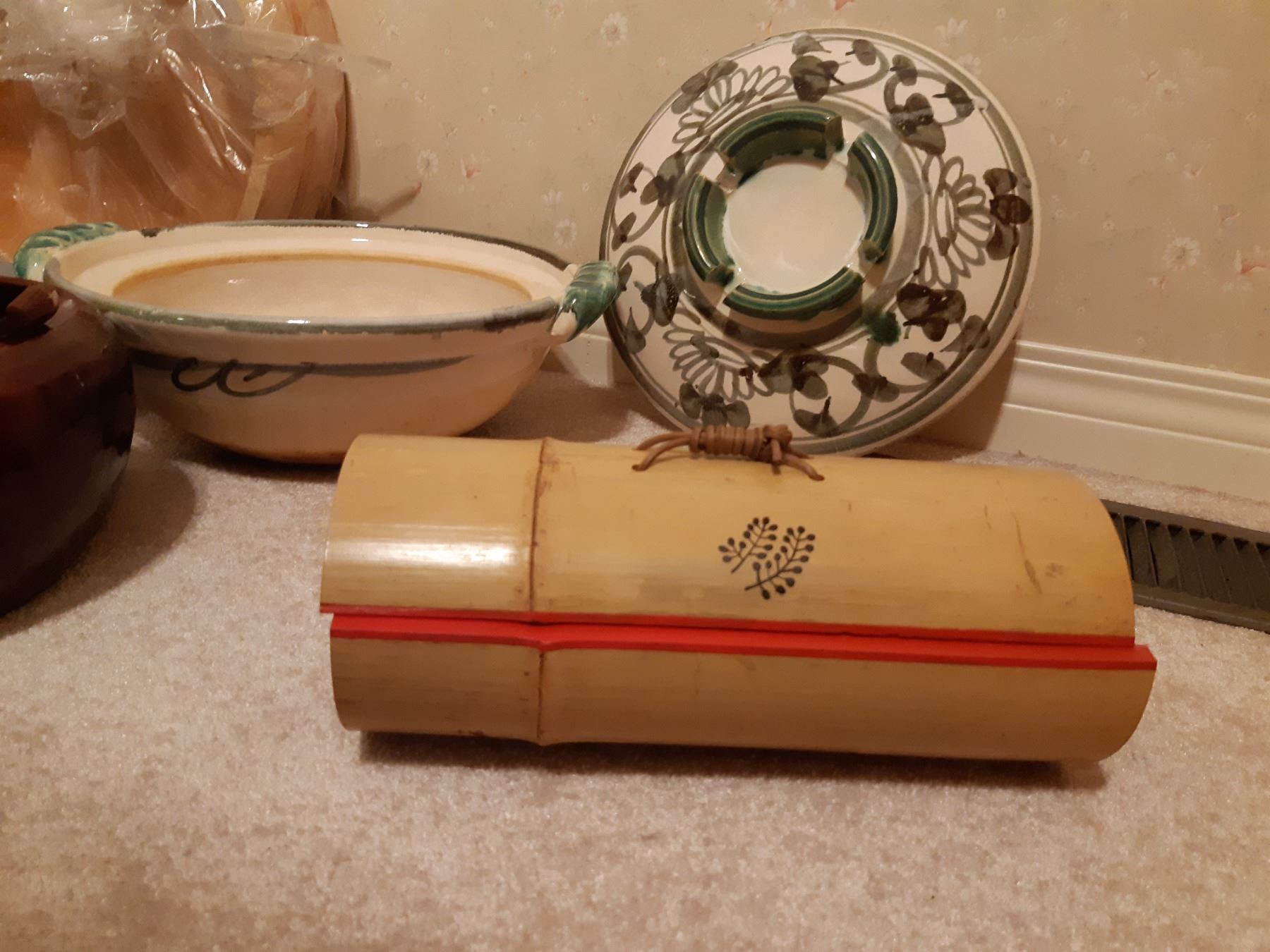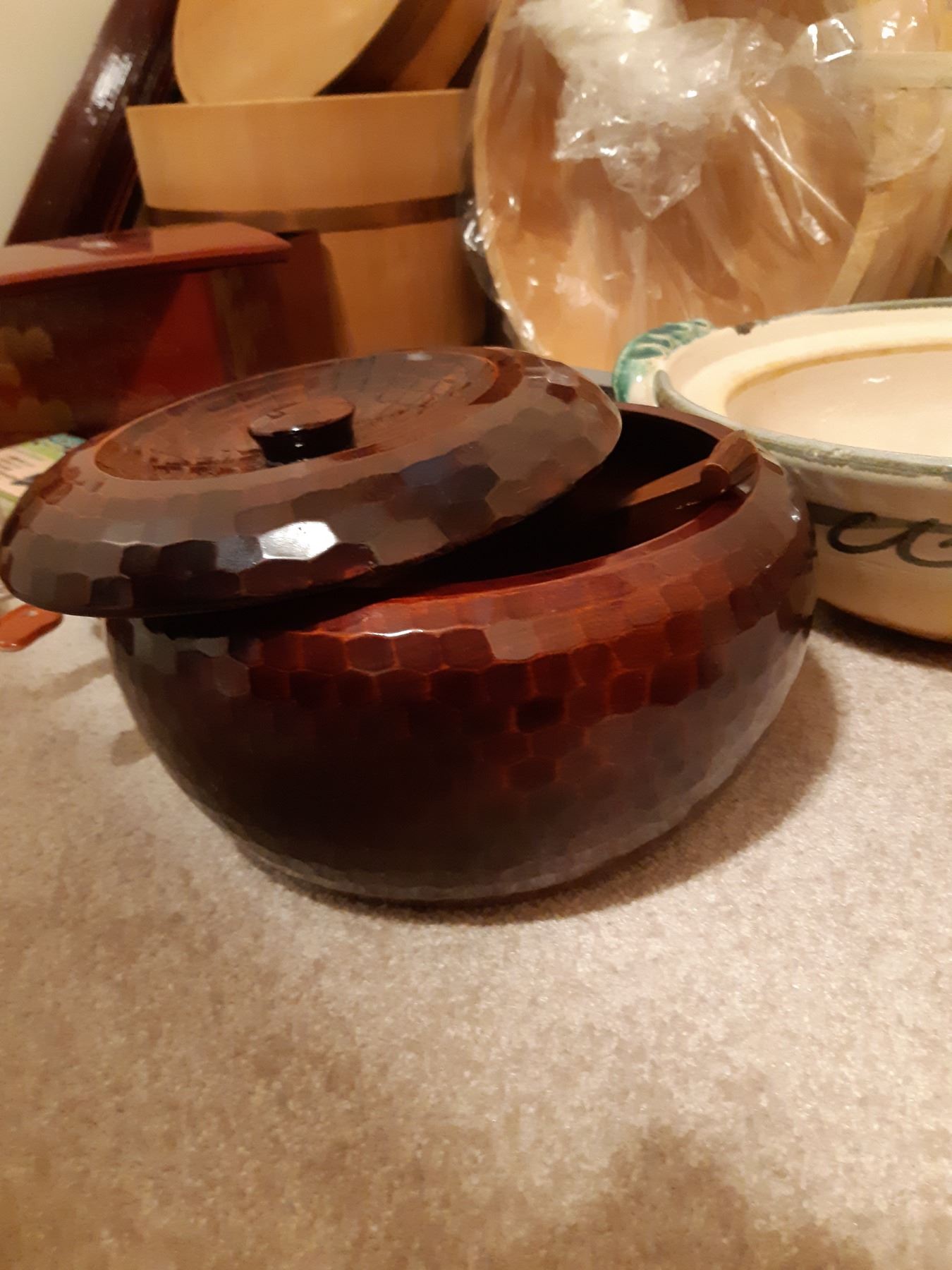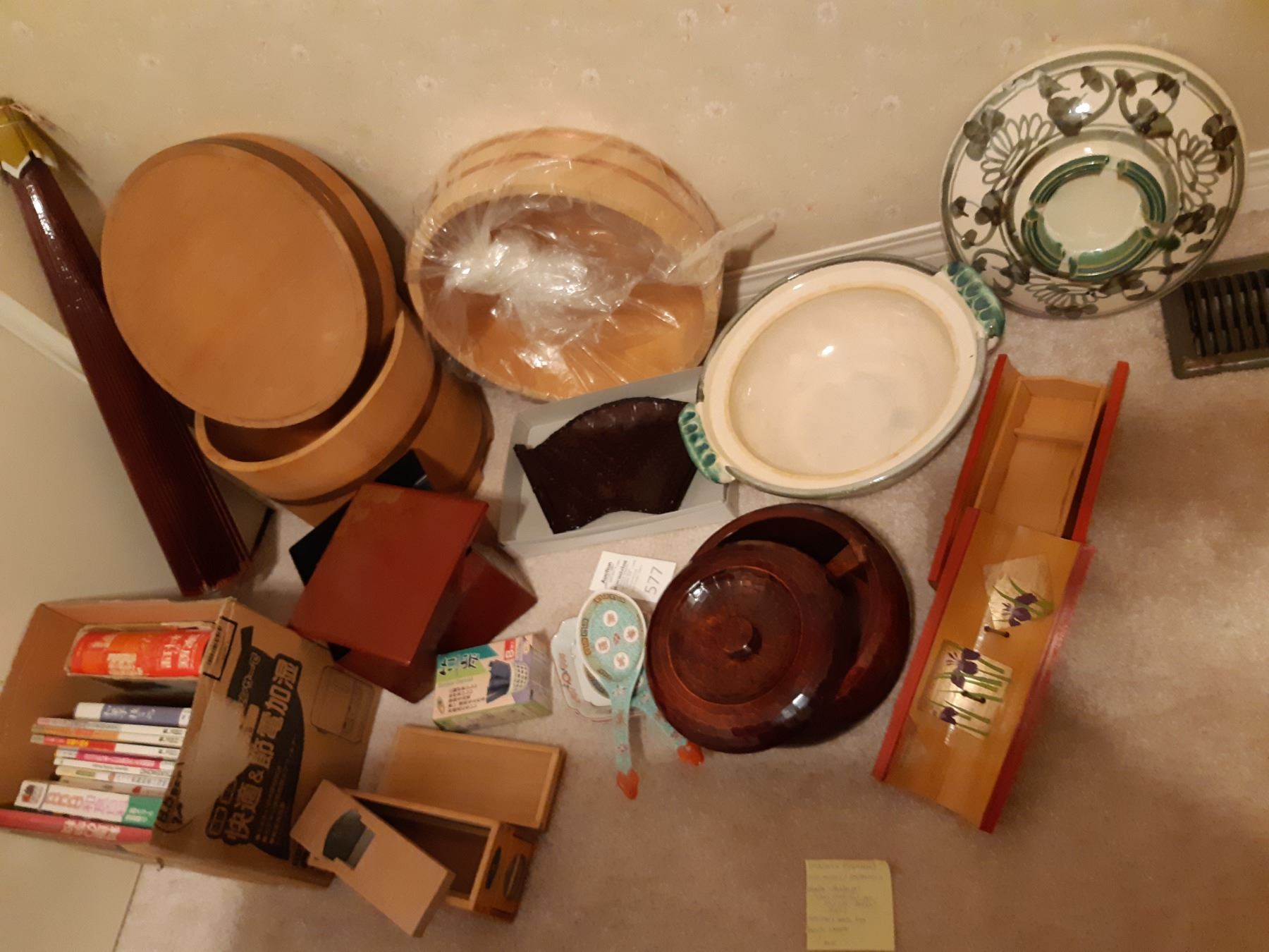 Cookbooks, rice mixers/containers, shabu - shabu pot, has a crack but can still be used and doesn't leak. New Year's bento box, bonito shaver and other misc pieces. Bring packing supplies and pickup at 10 am