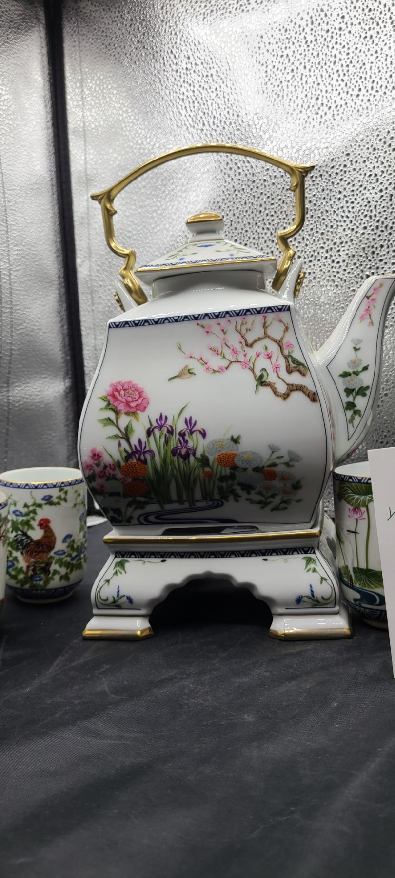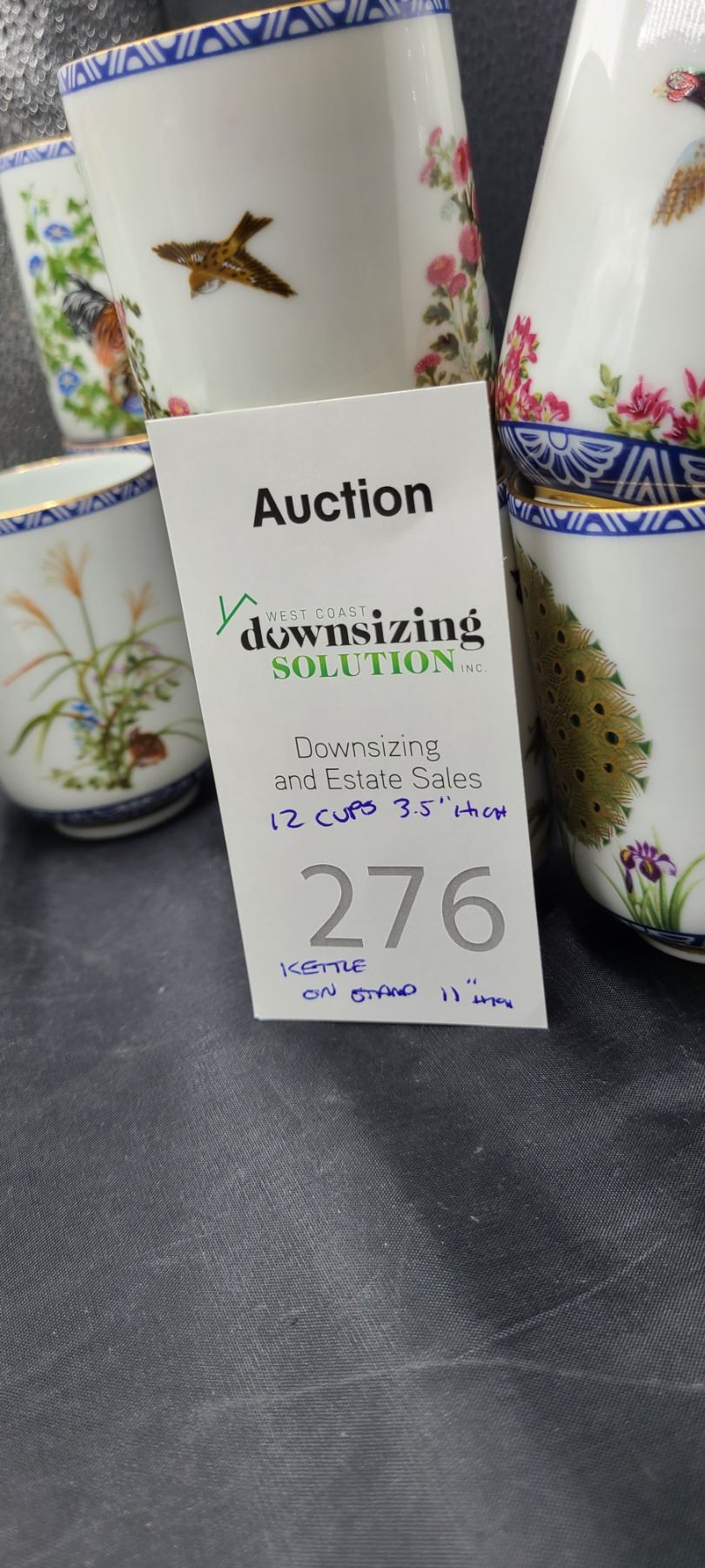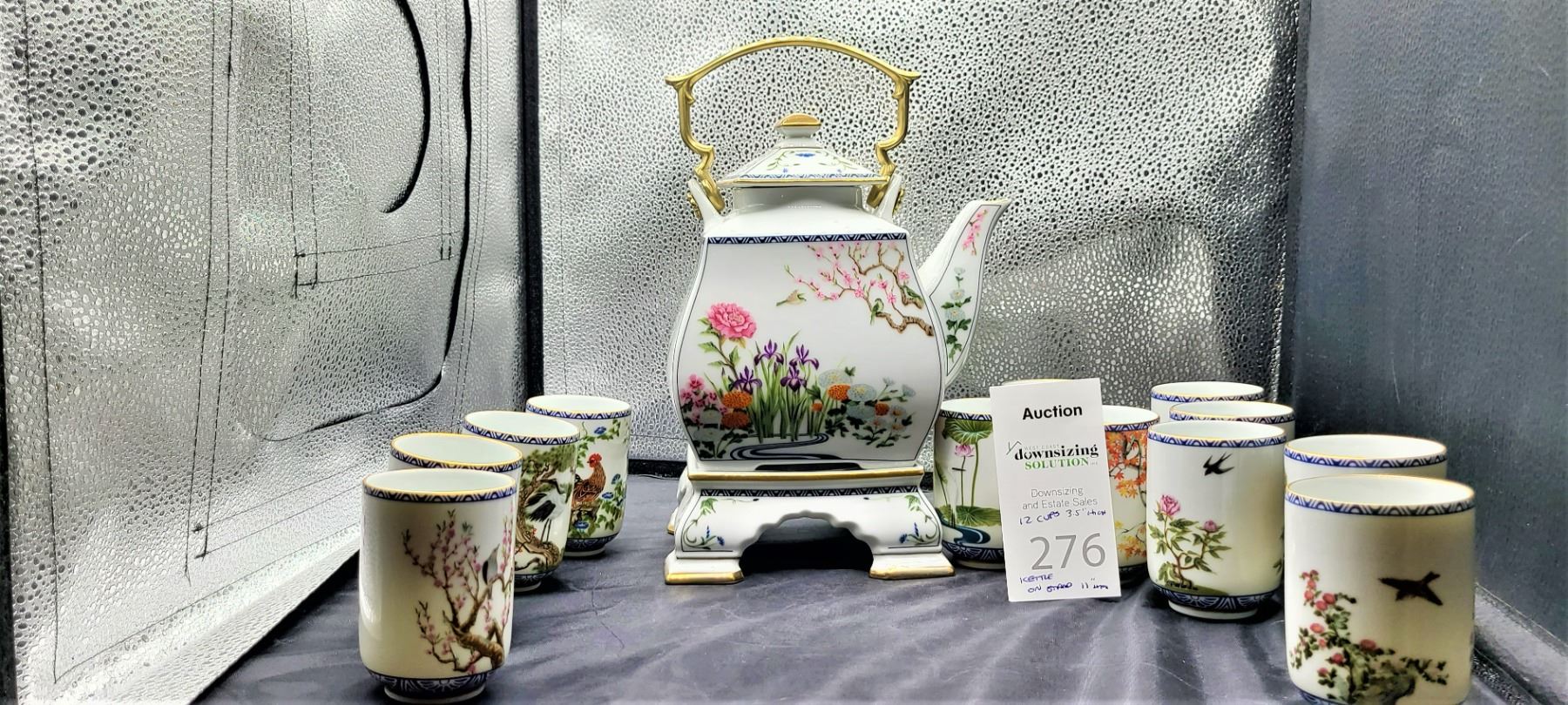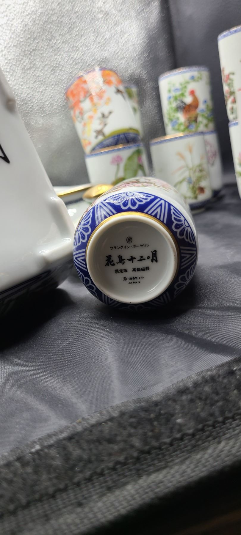 Set of 12 different hand painted cups, tea pot and stand. No chips or cracks noted. Franklin Mint Bring packing material. Pick up 9-10