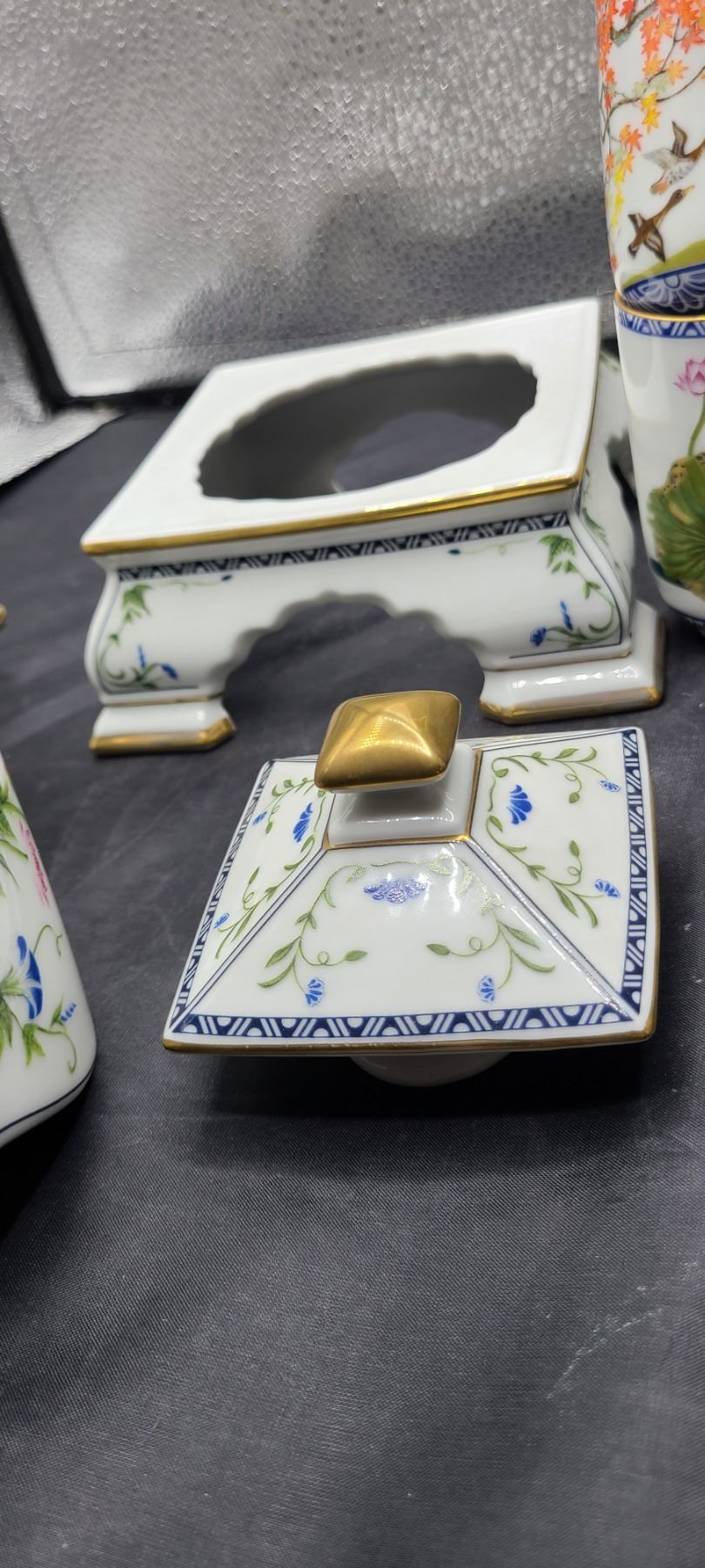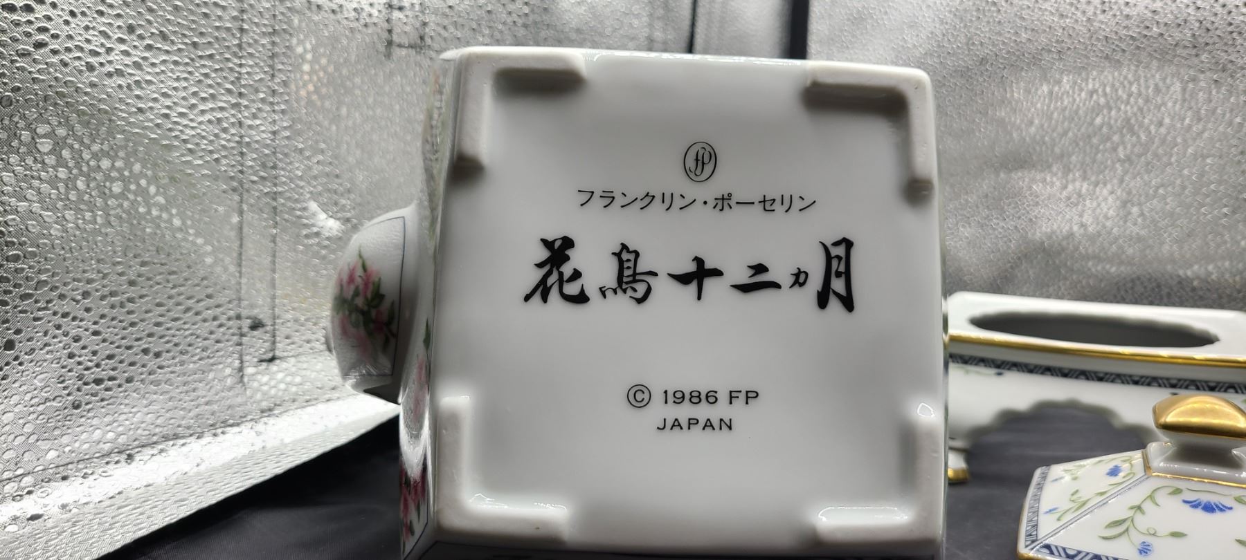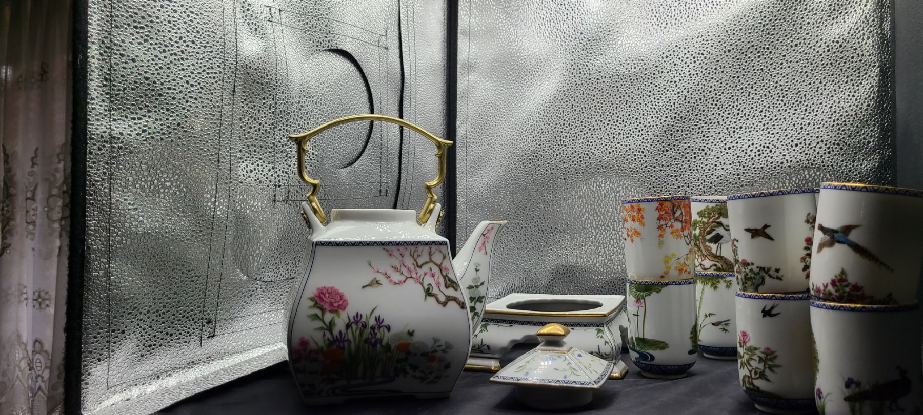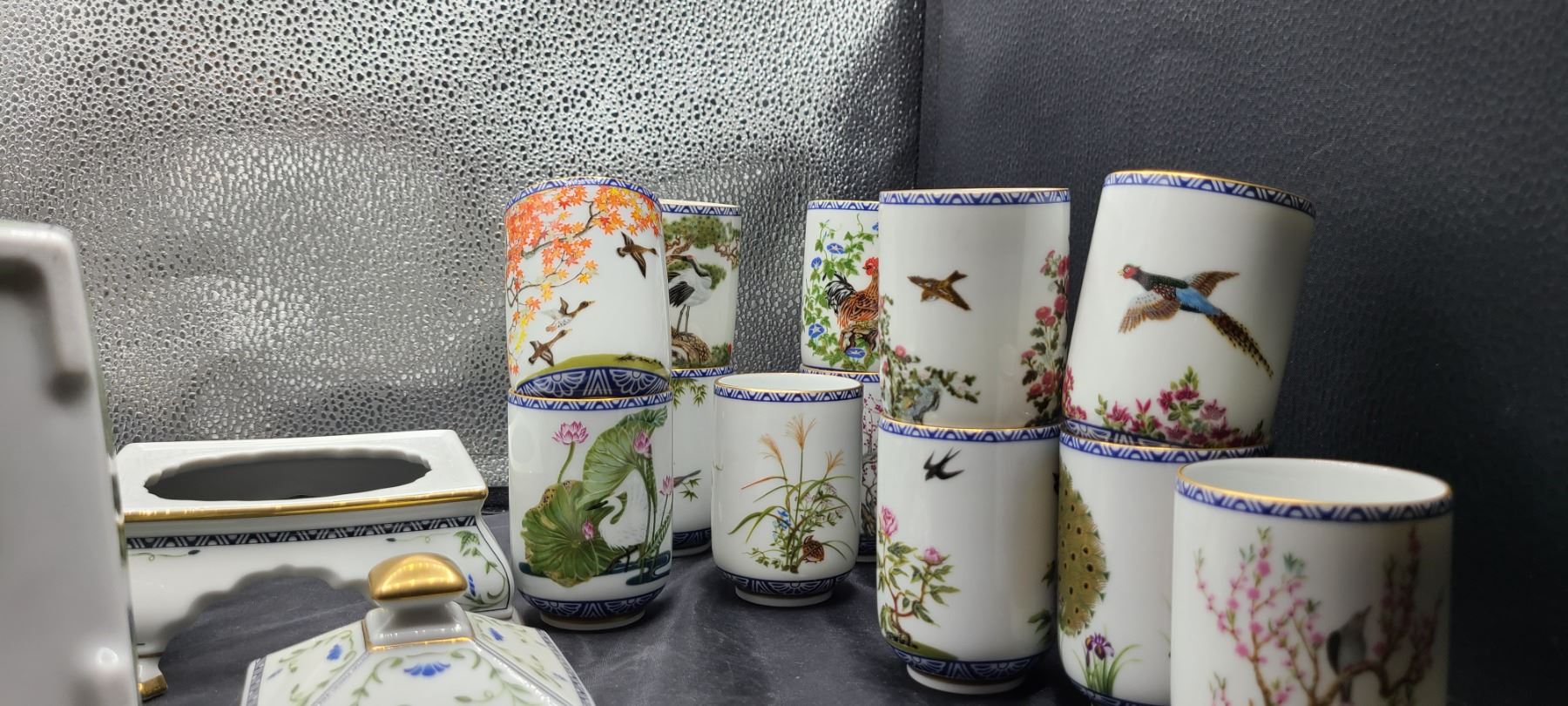 Set of 12 different hand painted cups, tea pot and stand. No chips or cracks noted. Franklin Mint Bring packing material. Pick up 9-10