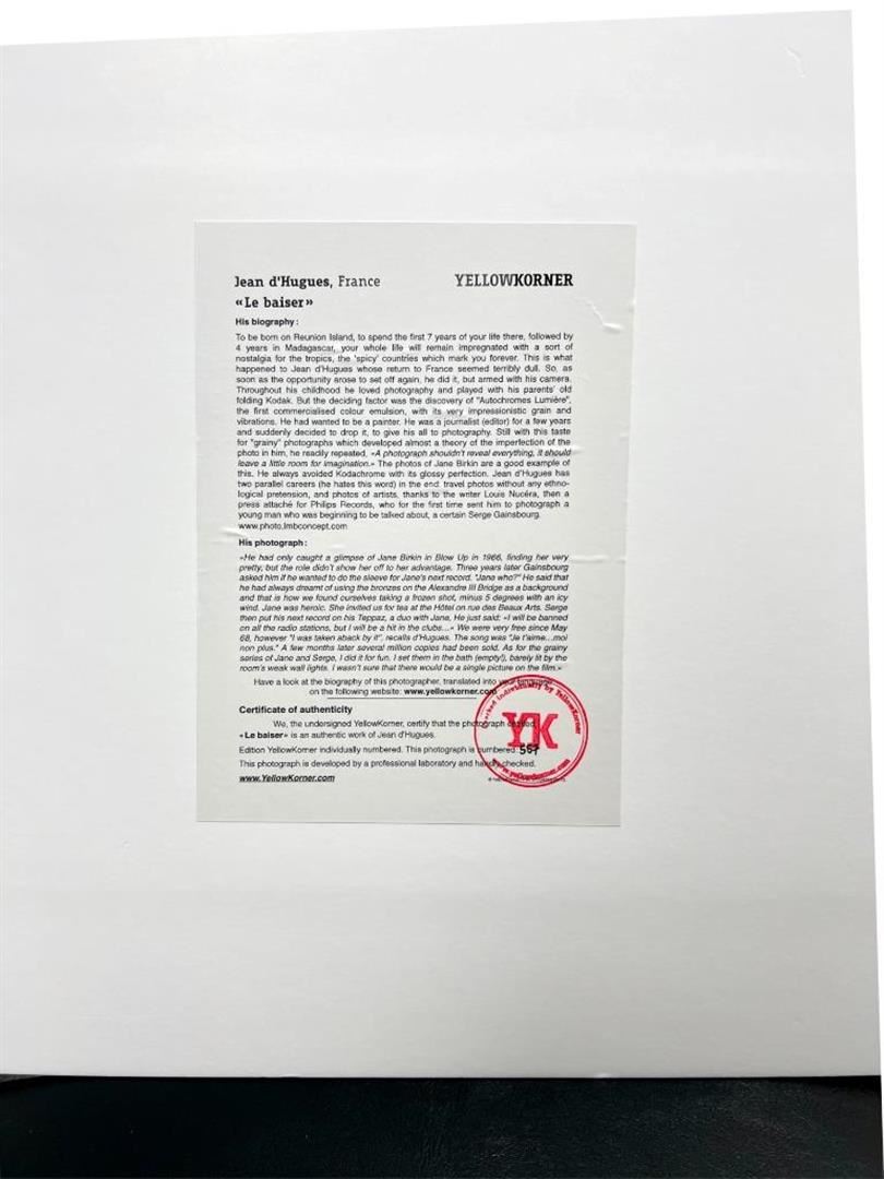 Jean D Hugues Le Baiser Jane Birkin and Serge Gainsbourg YellowKorner Certified Photograph. Certificate of Authenticity from YellowKorner affixed to the back. Matted Dimensions 16"x20". Protected with Clear Mylar Sleeve.