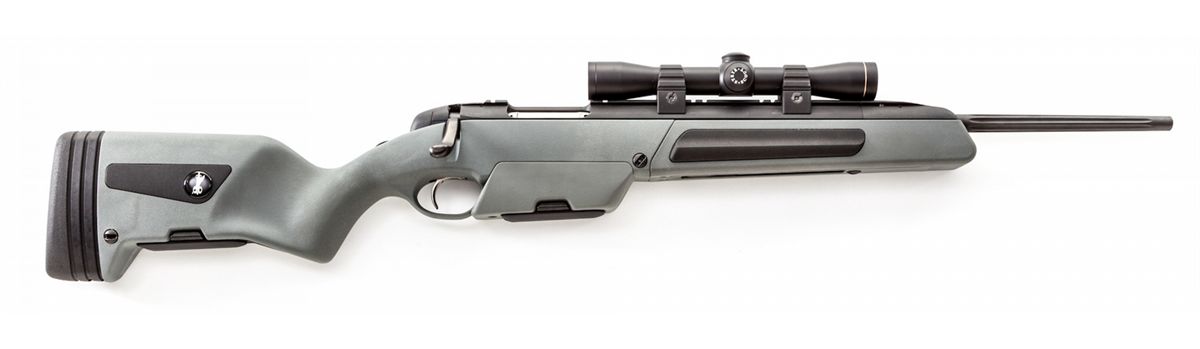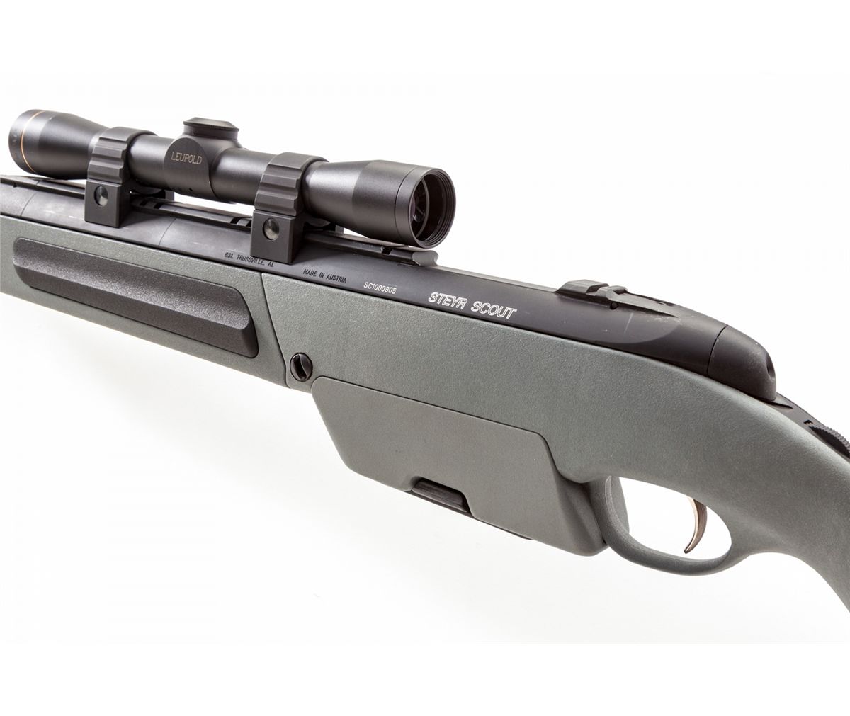 Mannlicher/Steyr Scout Bolt Action Rifle, as designed by Jeff Cooper, #SC1000905, .308 Win. cal., 19-1/4'' fluted barrel, matte finish, gray ''Zytel'' stock, with intregral scope rail and bipod. Topped with a Leupold M8 2.5x28 IER scope, on factory Steyr mounts. Complete with two magazines (one stored in buttstock), in its original Steyr gray hard plastic luggage case. Condition is excellent showing only the lightest marks from handling. Est.: $1,800-$2,400. (Modern)