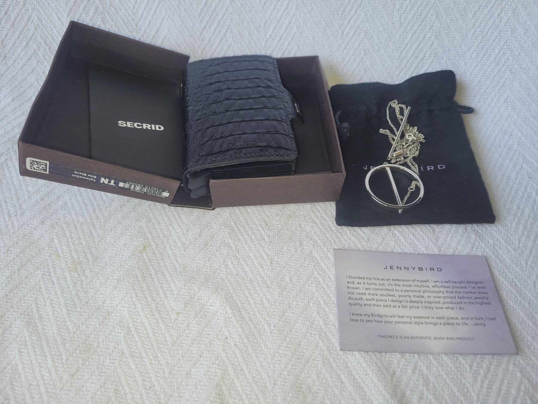 Secrid card protector and Jenny Bird necklace. Pickup at 9 am