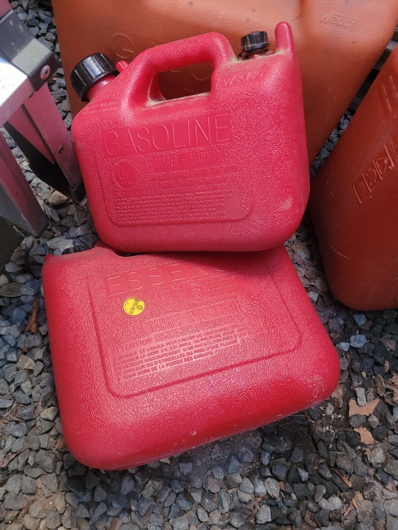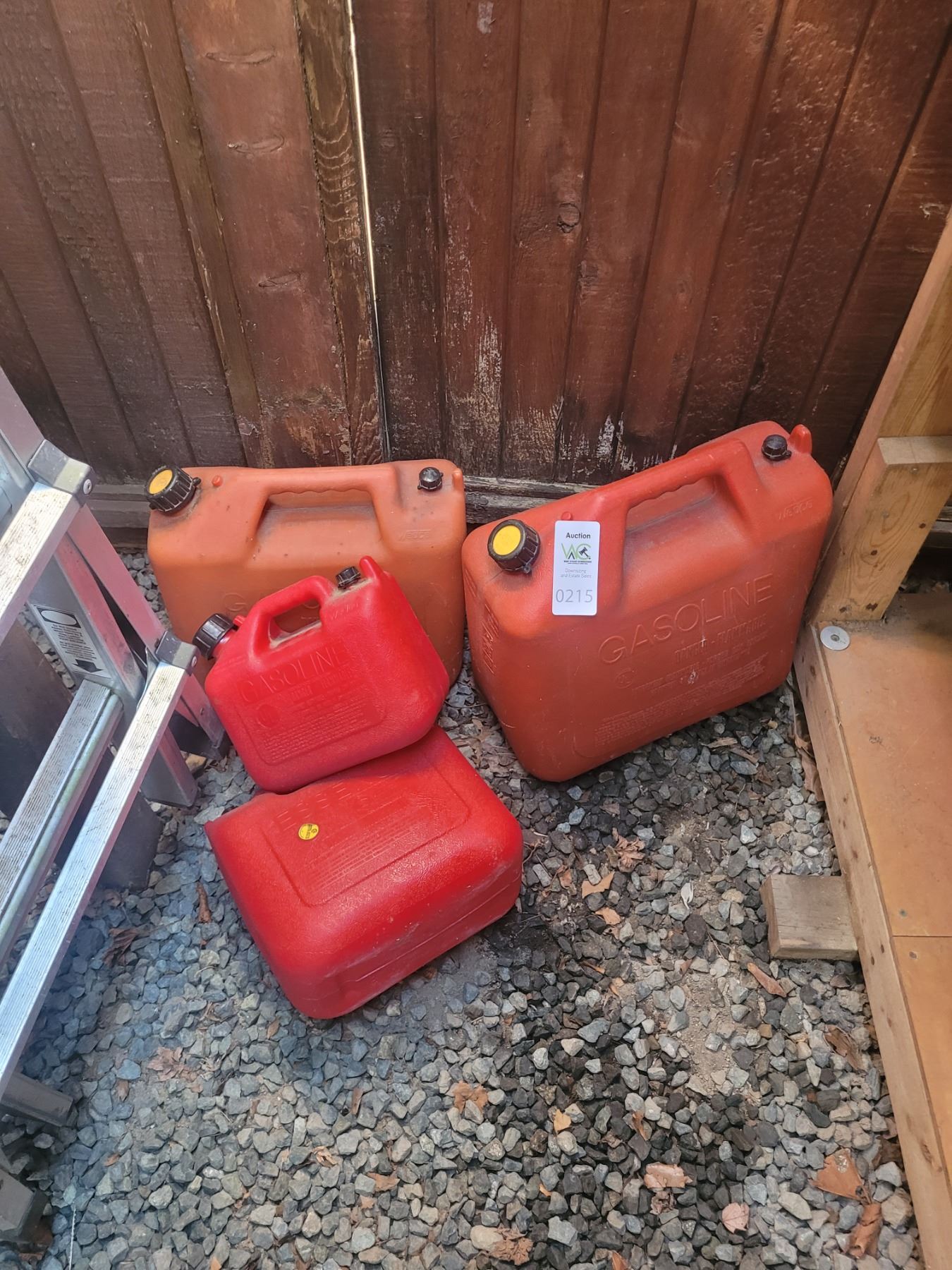 Assortment of gas, oil/mix plastic jerry cans. Pickup at 11 am