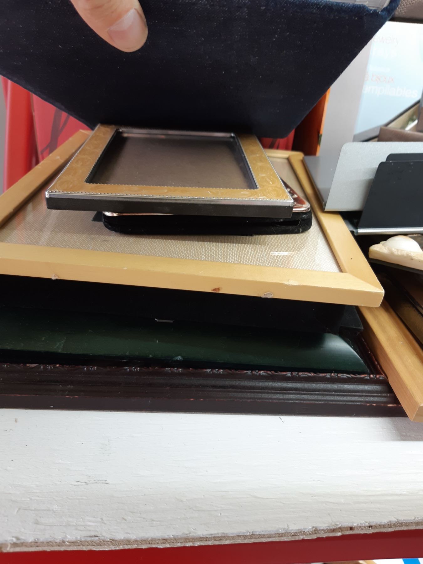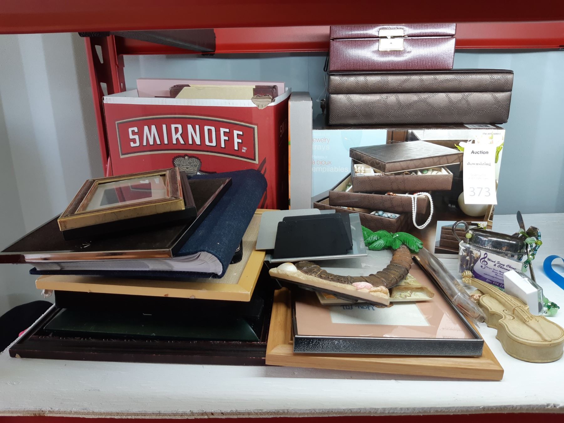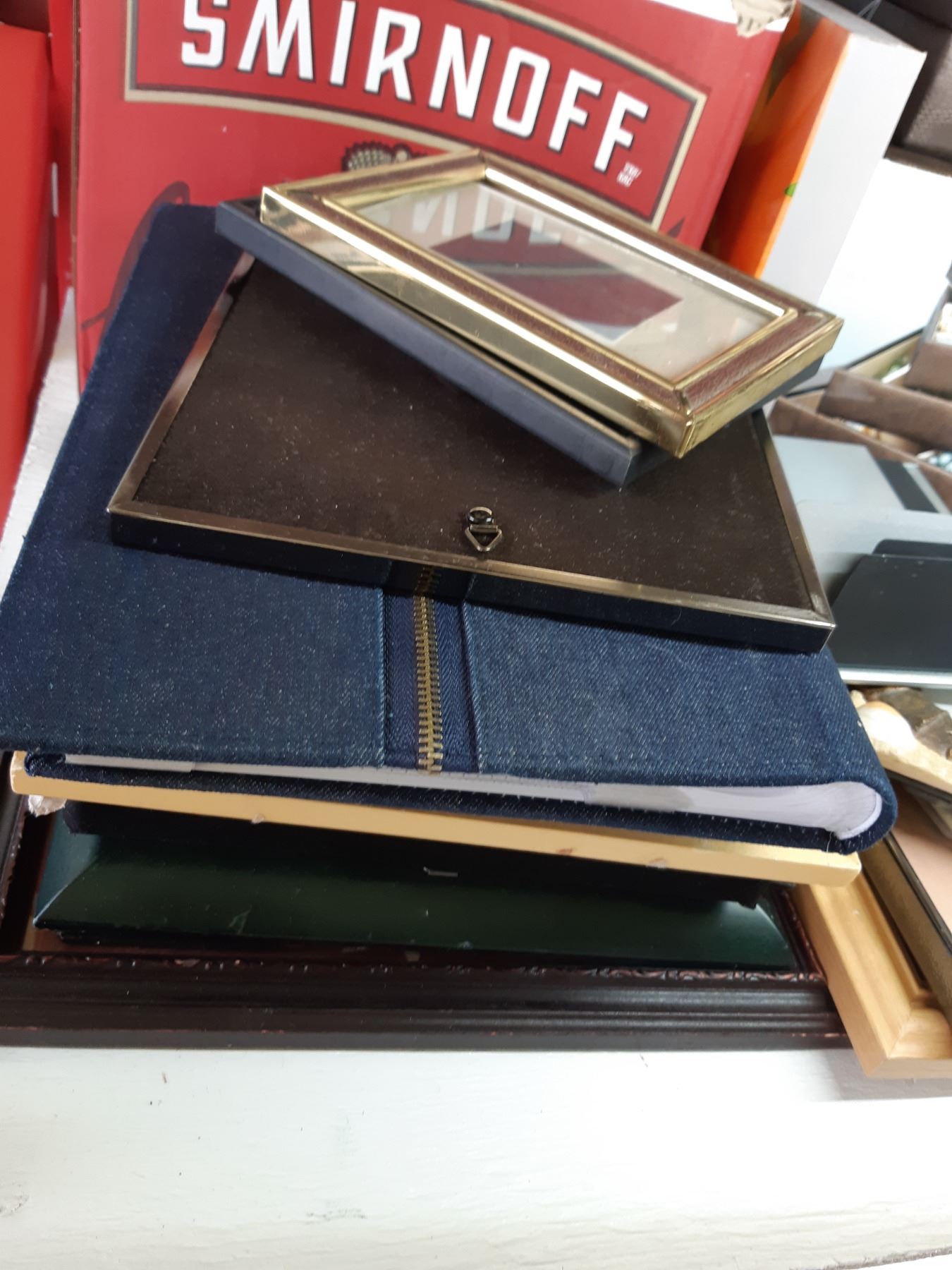 Jewely box with trays, new in box. Assortment of various size picture frames Bring packing supplies and pickup at 10 am